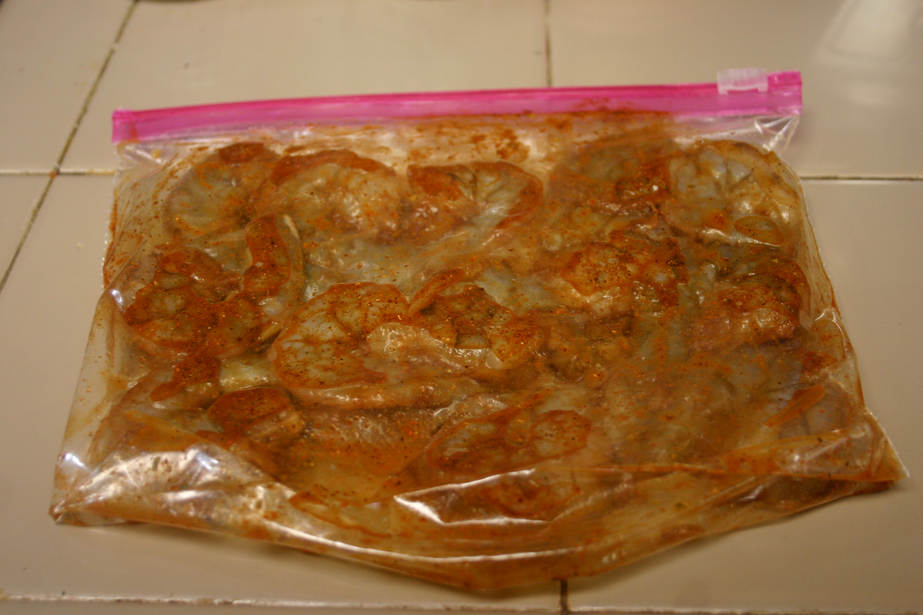 Peel and devein shrimp; remove tails. Place shrimp in a plastic bag. In a small bowl combine Red Chili Powder, Garlic Powder, Cumin, Chili Lime, Salt and Pepper. Sprinkle the seasoning blend over the shrimp. Toss to coat, let rest in the refrigerator for about an hour for the flavors to develop.