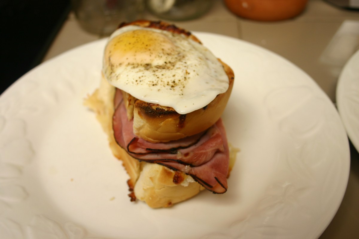 What is a Croque Madame? That was the first question from Kiddo and Hubby when looking at the week’s menu posted on the refrigerator. (And yes, I do post our meal plan – that way it ends the question What’s for dinner? And knowing in advance helps me plan out my day). When I said it’s a grilled ham and cheese sandwich topped with a fried egg, Kiddo asked why I couldn’t just say that. Truth be told, it sounds so much fancier in French.