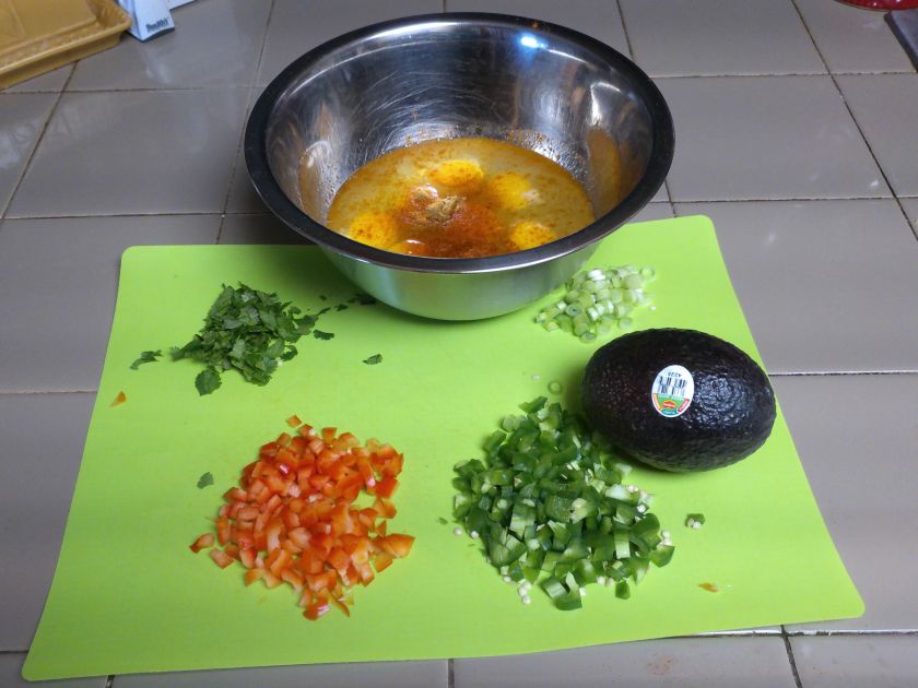 Core, seed and dice bell pepper, set aside. Core, seed and dice jalapeno pepper, set aside. Slice green onion and snip cilantro, set aside.