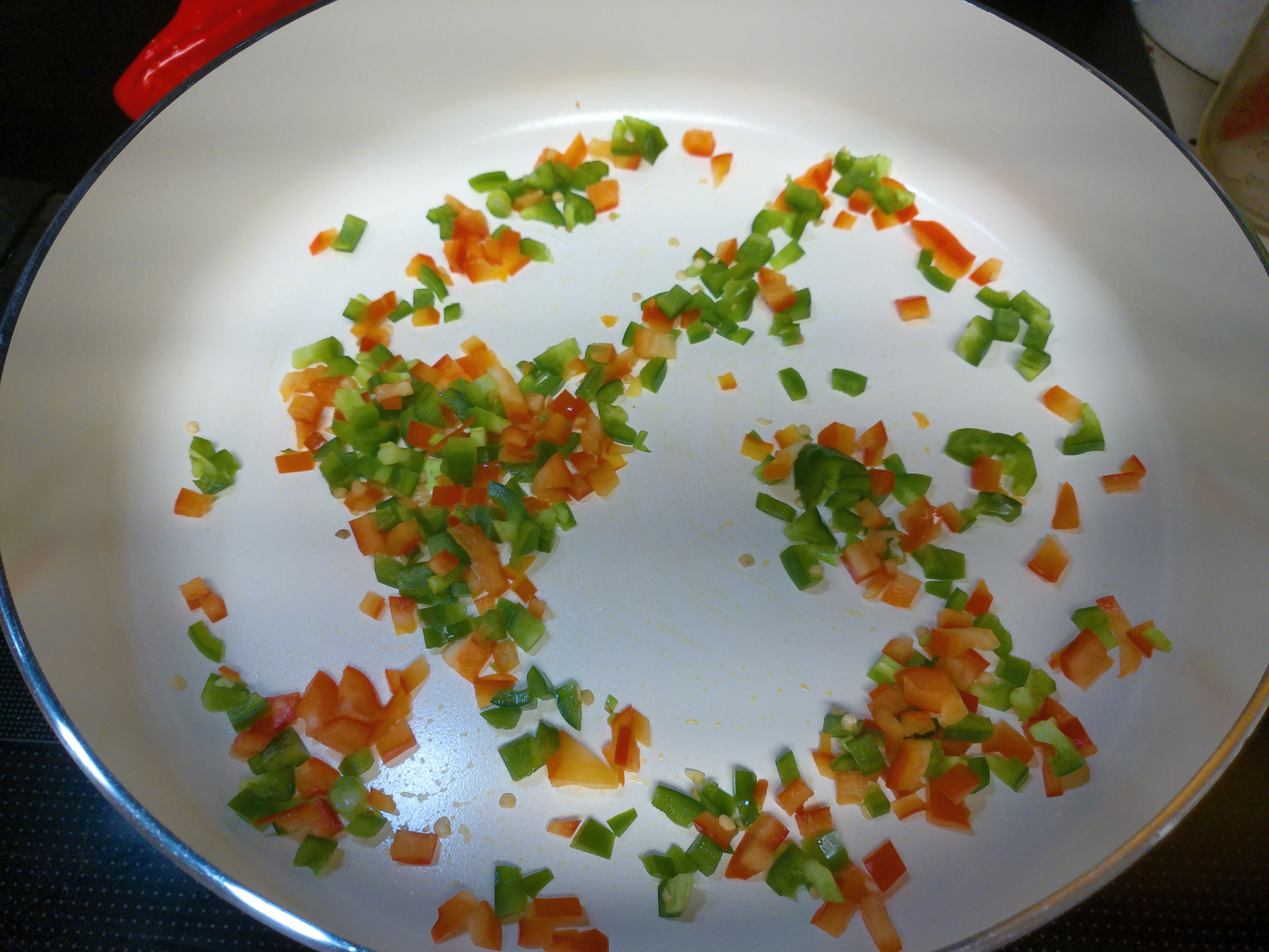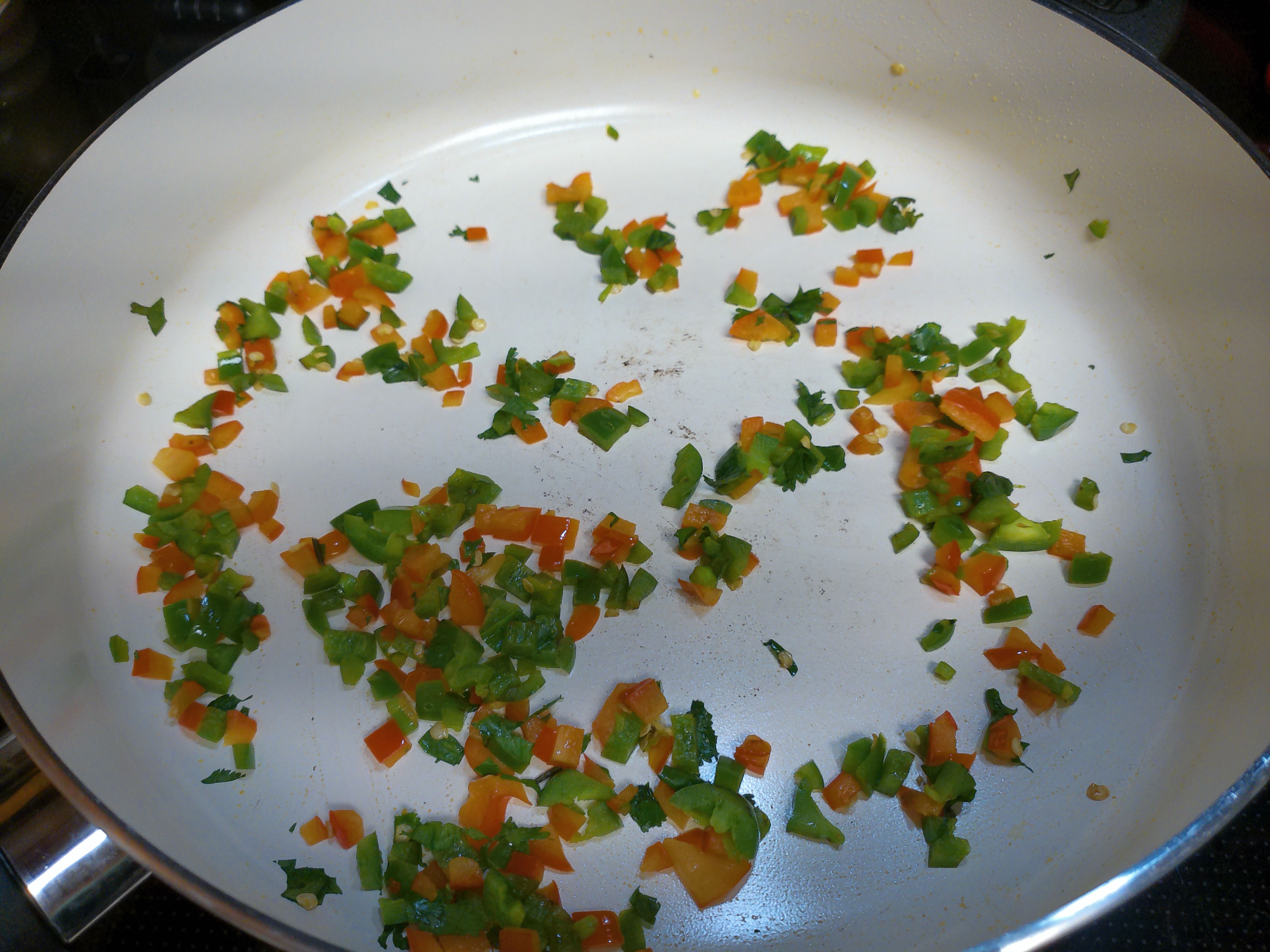 Spray a skillet with cooking spray, place over medium heat. Sauté bell pepper with jalapeno until beginning to soften. Add about a tablespoon of the cilantro to the pepper mixture, sauté about another minute or so.