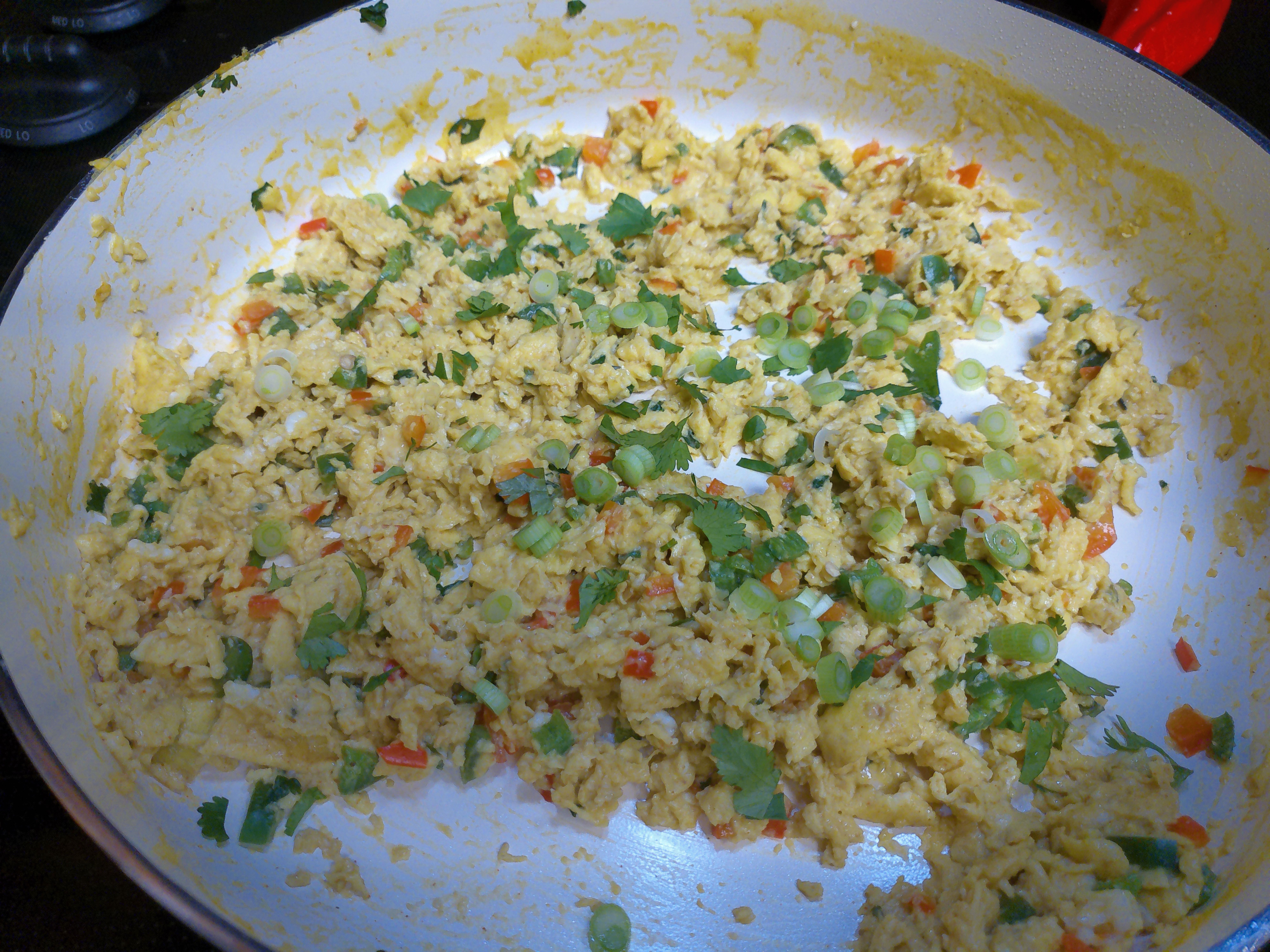 Pour egg over sautéed mixture in the skillet. Stir until eggs are just cooked. Remove skillet from heat. Season scrambled eggs with salt and pepper. Scatter green onions and remaining cilantro over the eggs. Cover to keep warm.