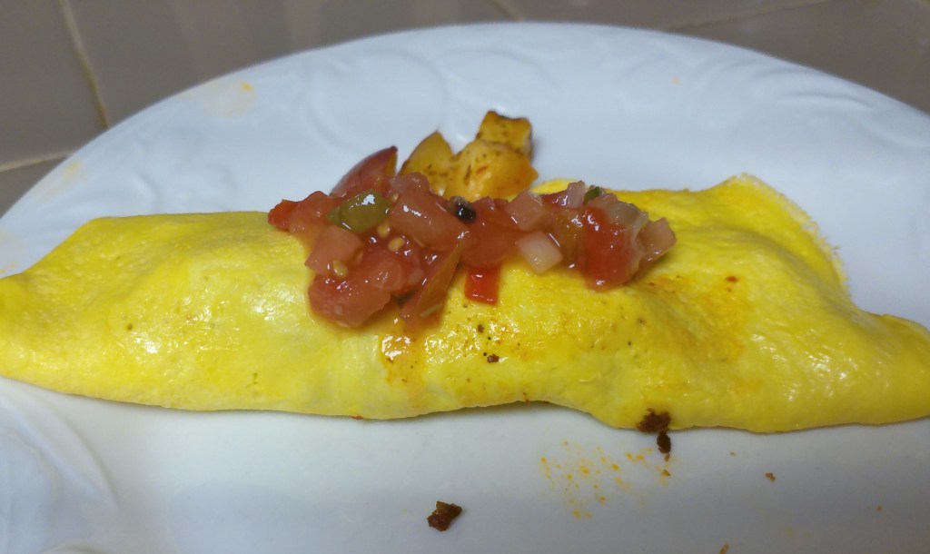 Return pan to heat, warm for about a minute or so, then repeat until all the egg crepes have been made. Serve, topped with salsa and enjoy.