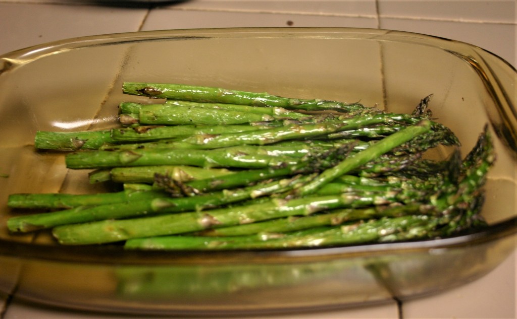 Rinse asparagus, trim wooded ends, leaving spears about 8-inches long. Season asparagus with salt and pepper, set aside.