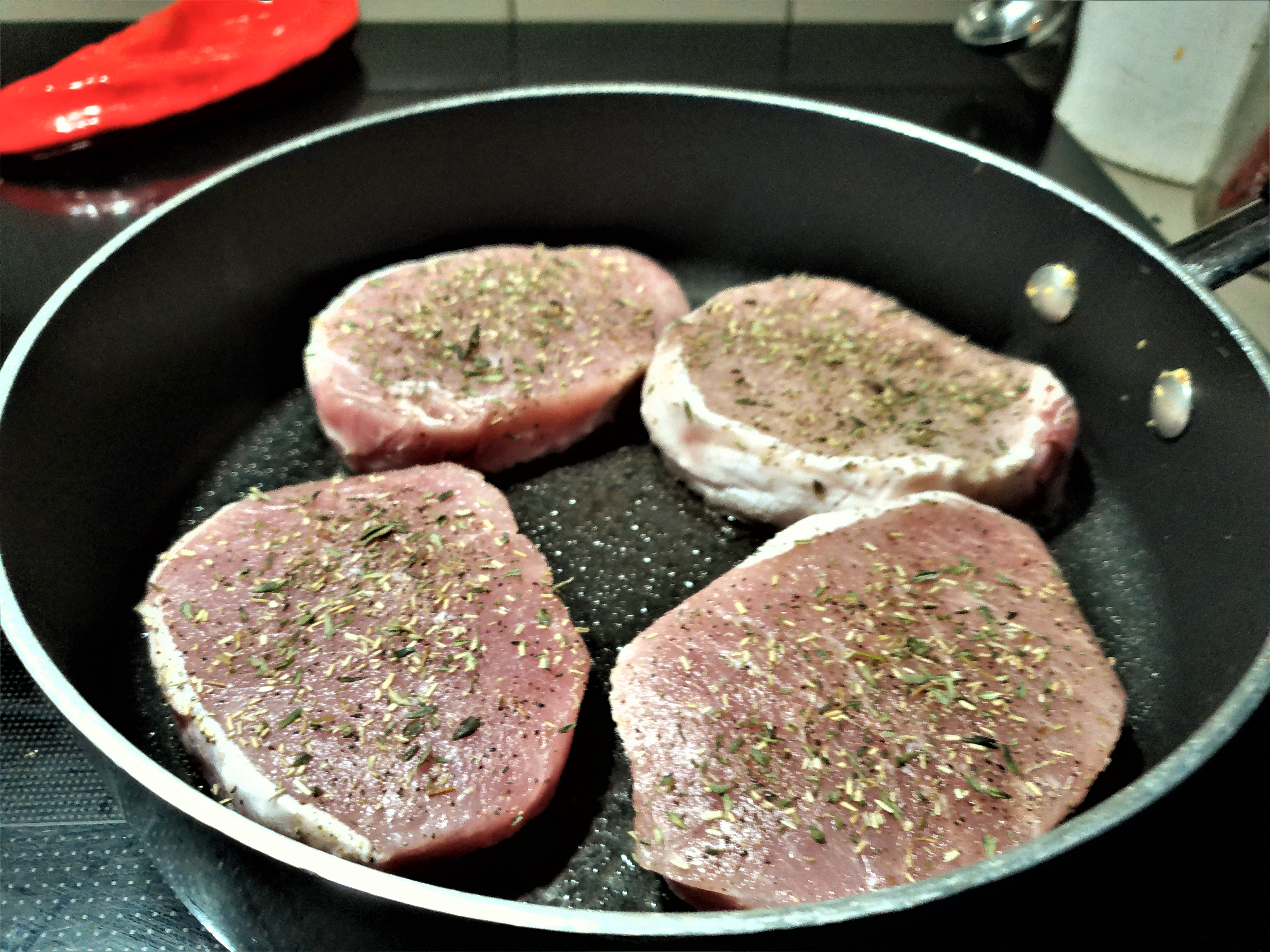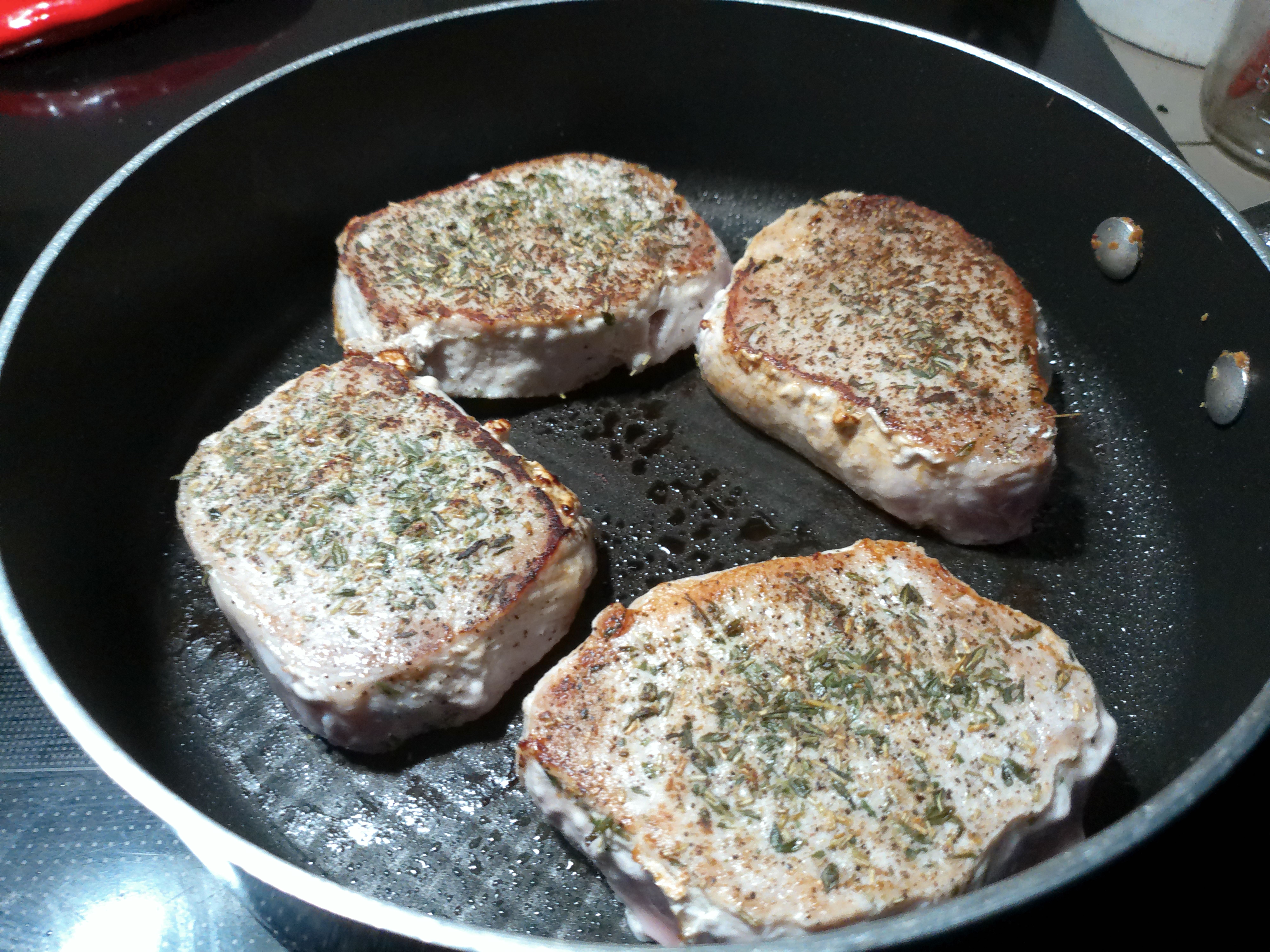 Trim fat from edge of chops. Spray a large nonstick skillet with cooking spray; heat over medium heat 1 to 2 minutes. Season pork with Rosemary, Thyme, salt and pepper to taste. Cook aromatic chops in hot skillet about 4 minutes, turn and continue to sear another 3 minutes or until light brown.