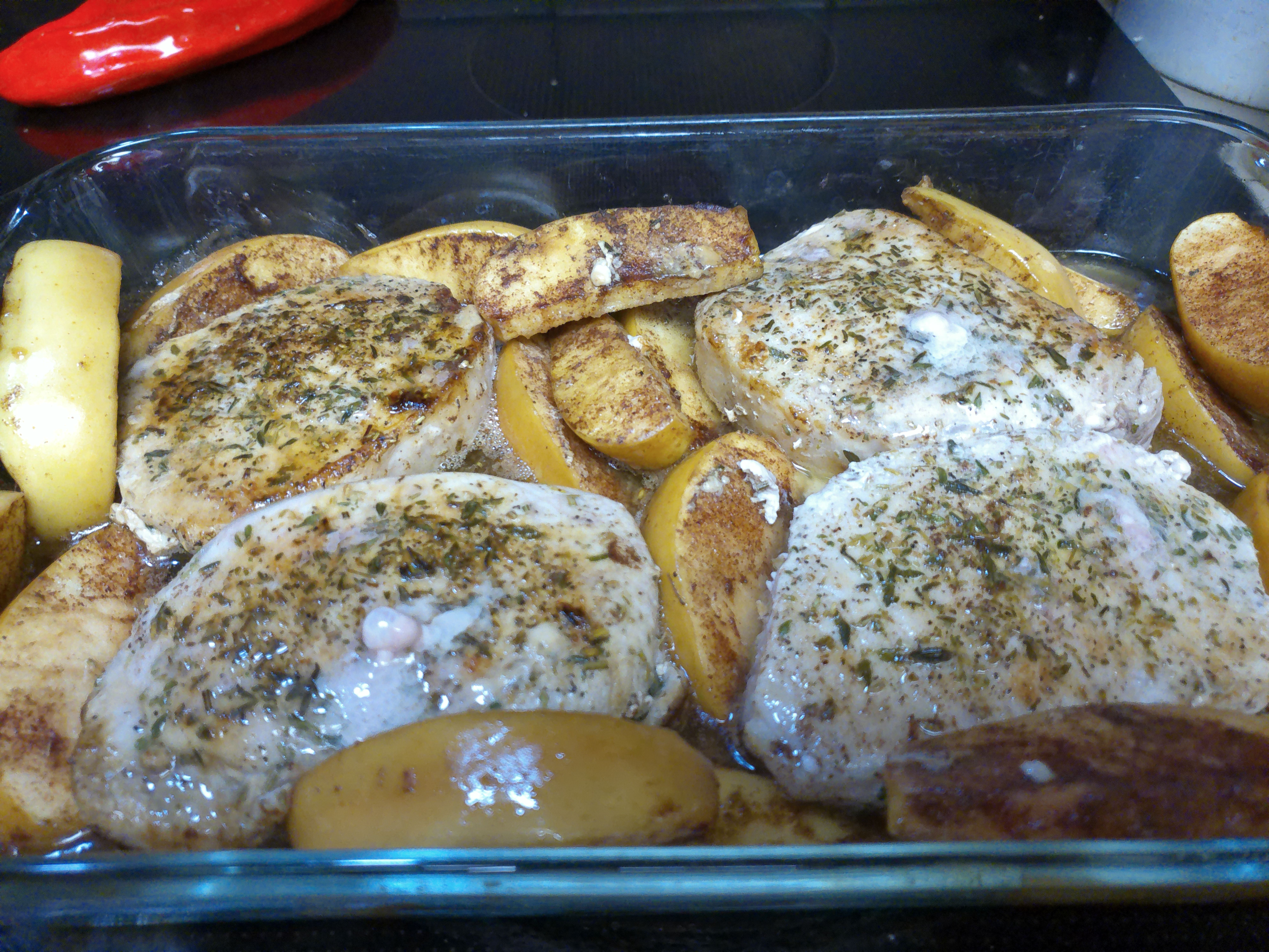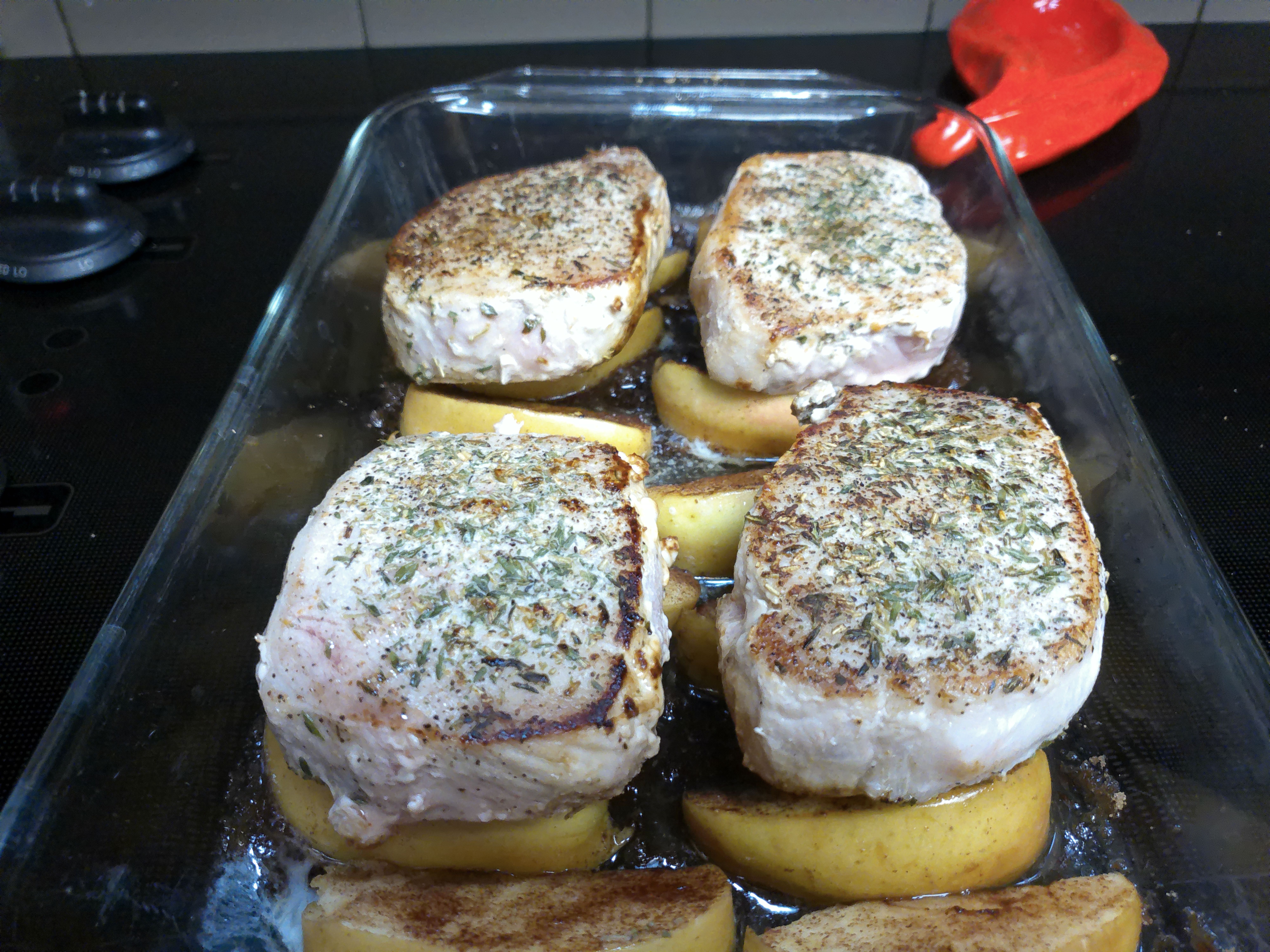 Place pork in single layer on apples. Cover and bake 15 minutes or until pork reaches an internal temperature of 145 degrees and apples are tender. Remove from oven, turn chops, nestle down into the apples and bake another 5 minutes before serving.