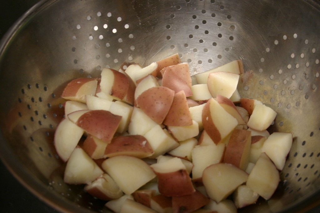Scrub potatoes. Cut into cubes, place in a saucepot. Add enough water to cover the potatoes. Bring to a boil, lower heat to a steady rolling boil and let cook for about 6 minutes. Drain well. Let potatoes sit in a colander to air dry for about 5 minutes or so.