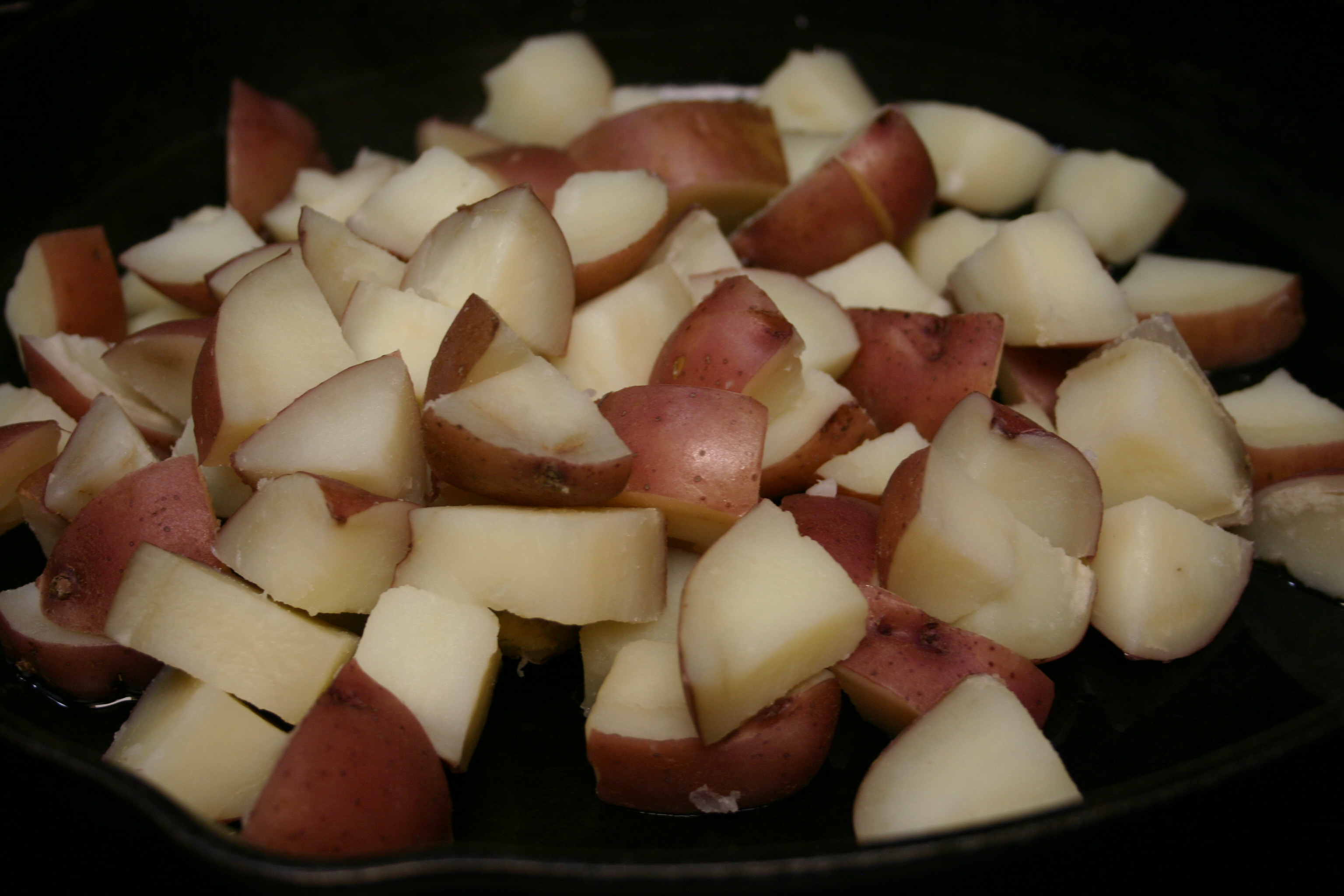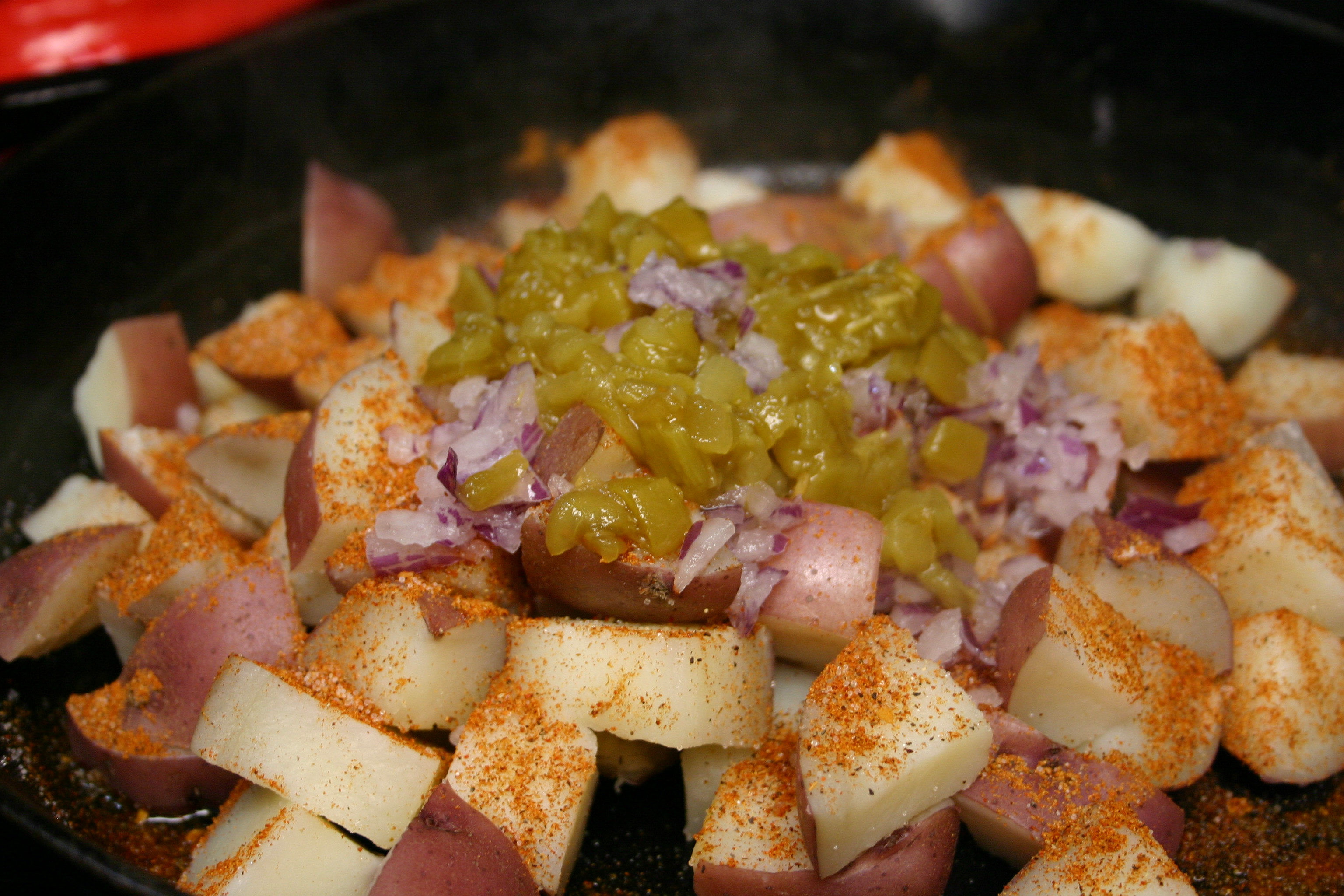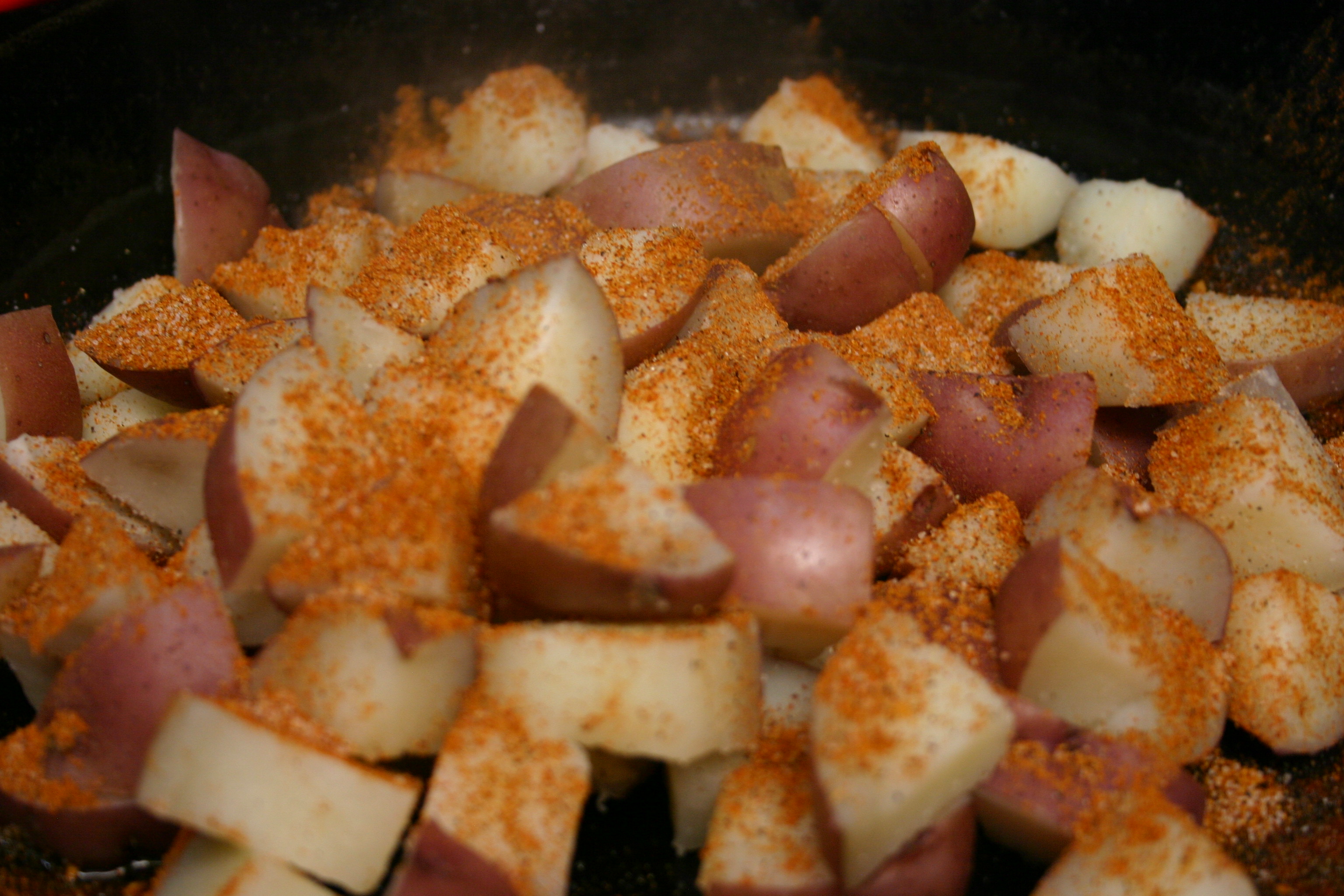 Fry potatoes until beginning to brown, turn and continue to cook until crisp on the outside, soft inside, about 10 minutes or so total. Taste and adjust seasonings just before serving.
