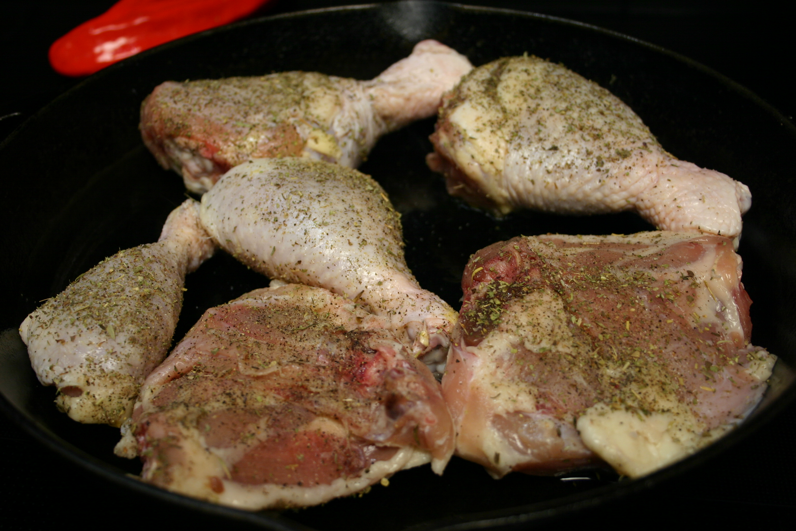 While the skillet heats, cut quarters at the joint to create 4 pieces of chicken with skins. Pat all chicken dry, then season with salt, pepper and Italian Seasoning. Arrange chicken pieces, skin side down, in the heated skillet. Fry for a few minutes to crisp skin, turn and fry a few more minutes for even browning.