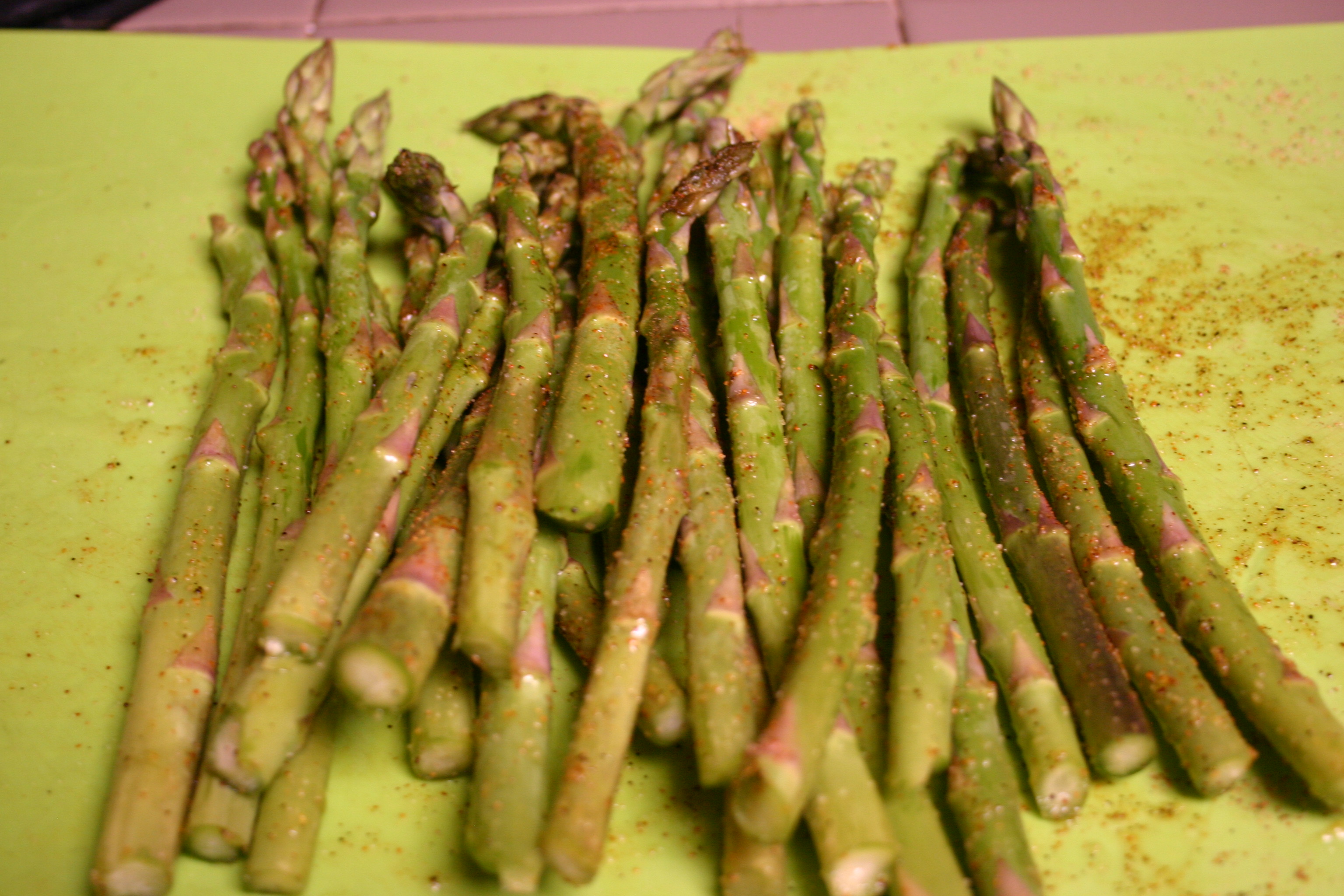 Clean asparagus, snap wooded ends. Pat dry, place on a cutting board. Drizzle asparagus with olive oil, season to taste with Cajun Spice. Toss to coat.