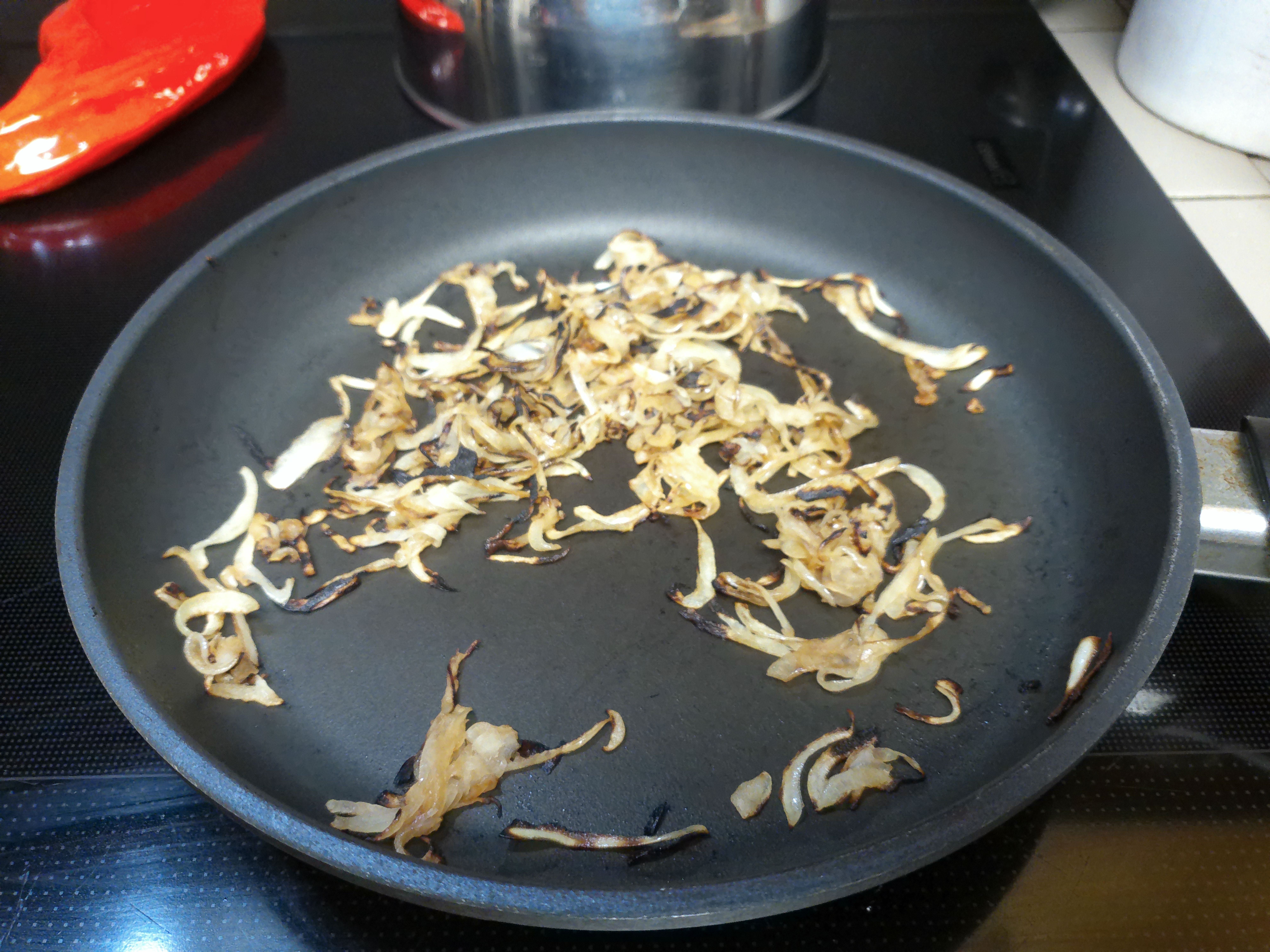 Cut onion in half from root to tip. Reserve half of the onion for another purpose, peel and thinly slice remaining half. Sauté onions in a skillet until golden brown and just beginning to crisp. Set aside.