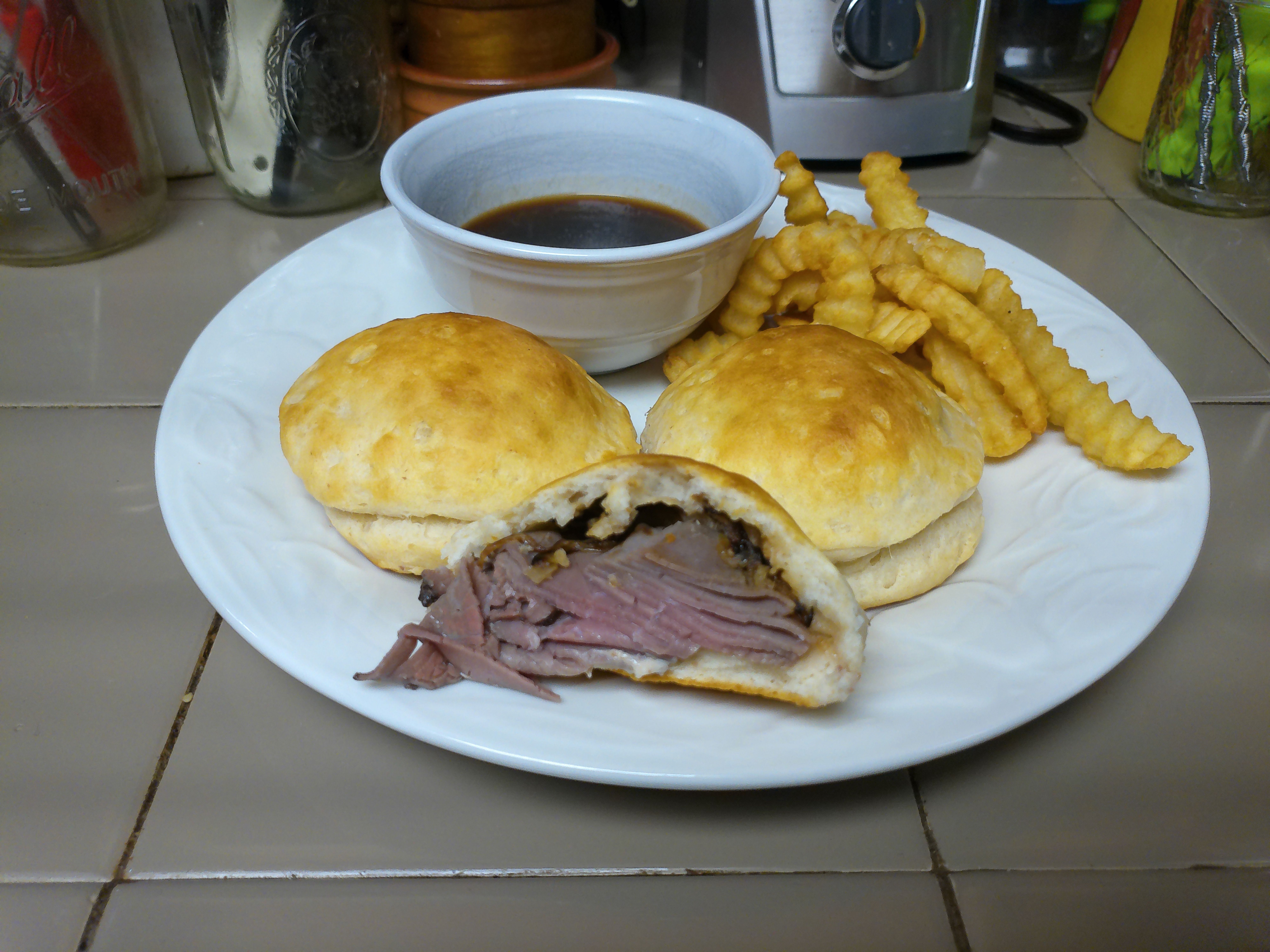 When ready to serve, lade Au Jus into individual small bowl such as ramekin cups. Arrange biscuits around the cups. Serve with Fries and enjoy.