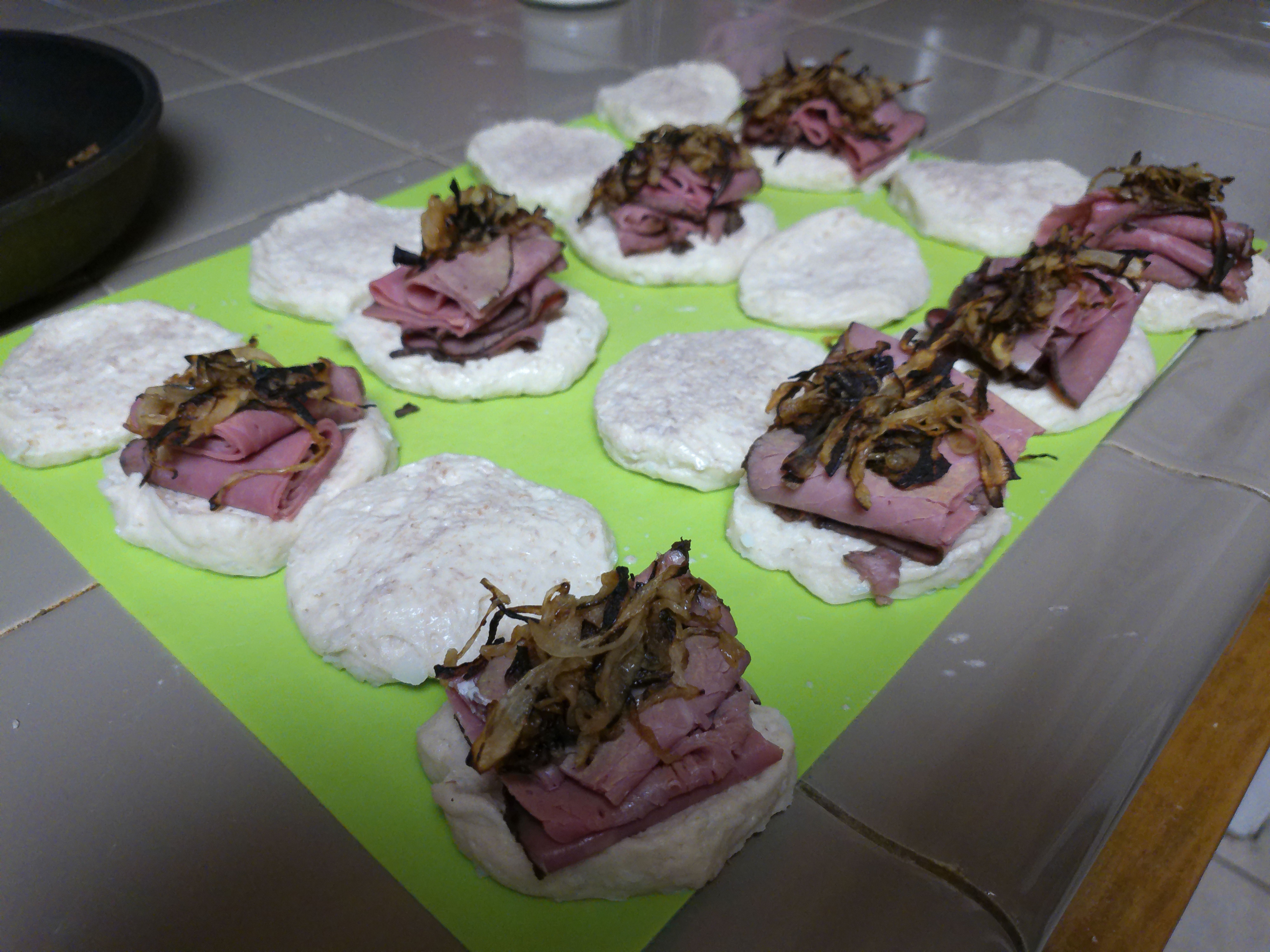 Open biscuits. First break apart into 8 full biscuits, then cut each biscuit in half to create a top and bottom for each biscuit bomb. Lay biscuits, cut side up, on a flat surface. Spread a little horseradish on each biscuit half. Working with one slice of roast beef at a time, fold the beef and cut in half to fit onto a biscuit bottom. Press into place. Repeat until all the bottom biscuits have a layer of roast beef. Top the roast beef with grilled onions. Place the top half of the biscuit, horseradish side down, over the filling. Pinch the edges to create a seal. Tuck excess dough under to create a clean circle.