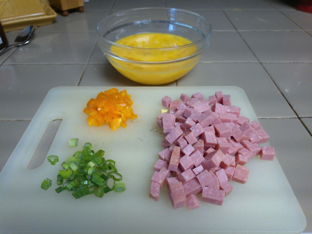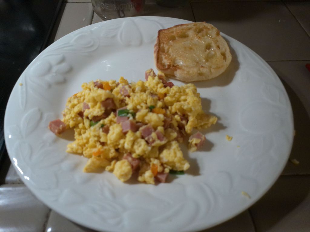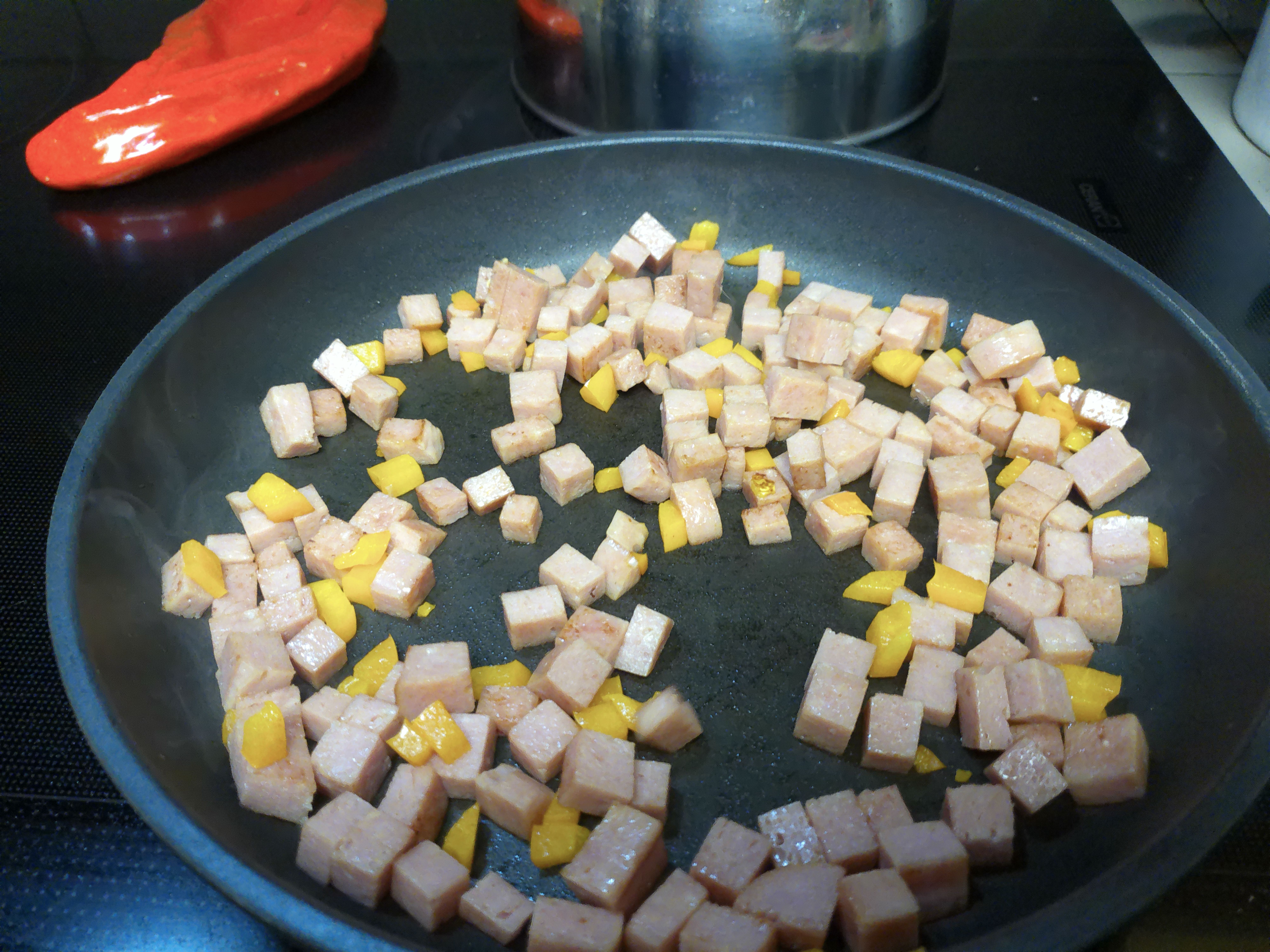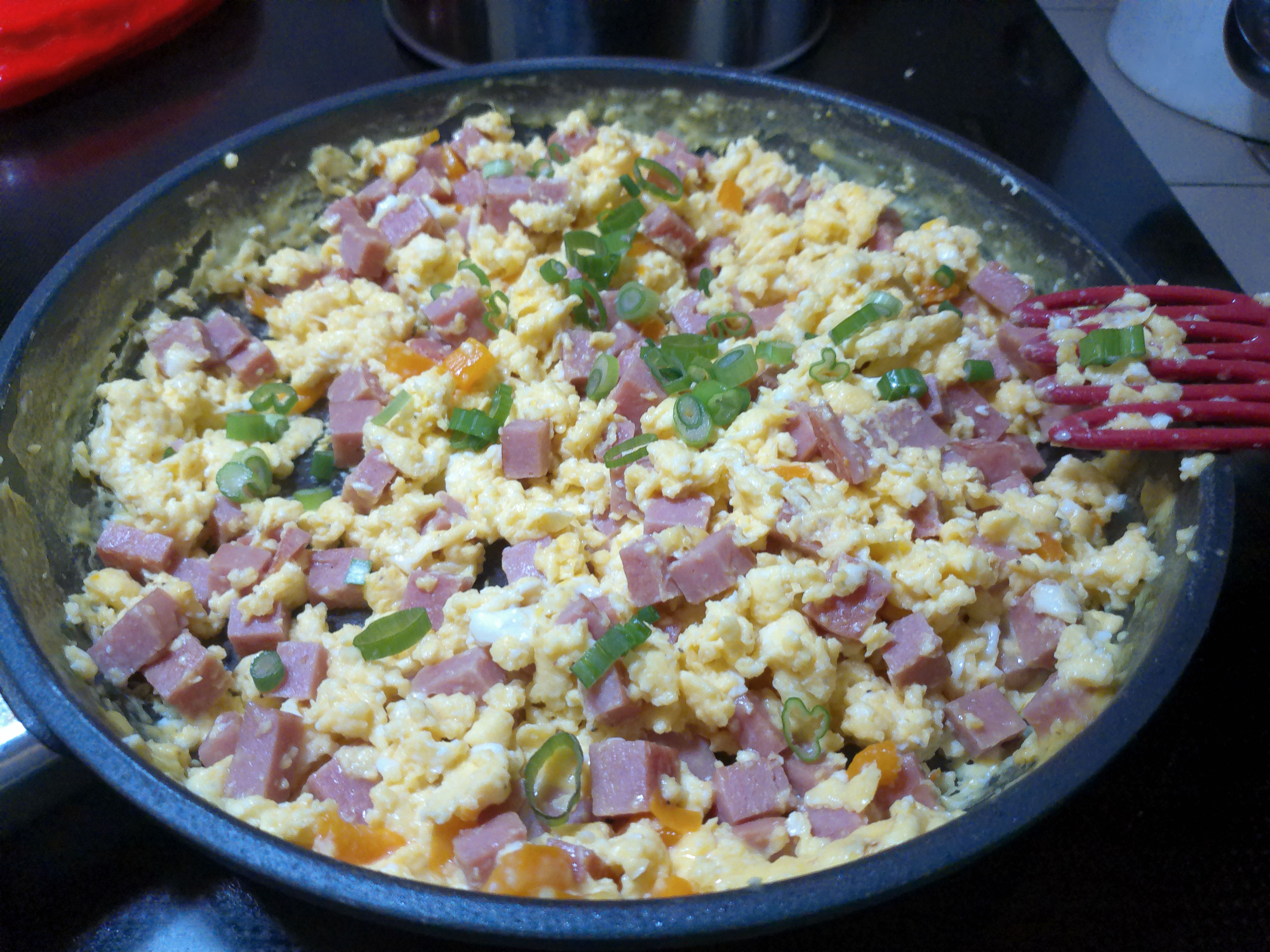 What’s for breakfast? Scrambled Eggs with Diced Spam. Oh, Spambled Eggs – sounds good!