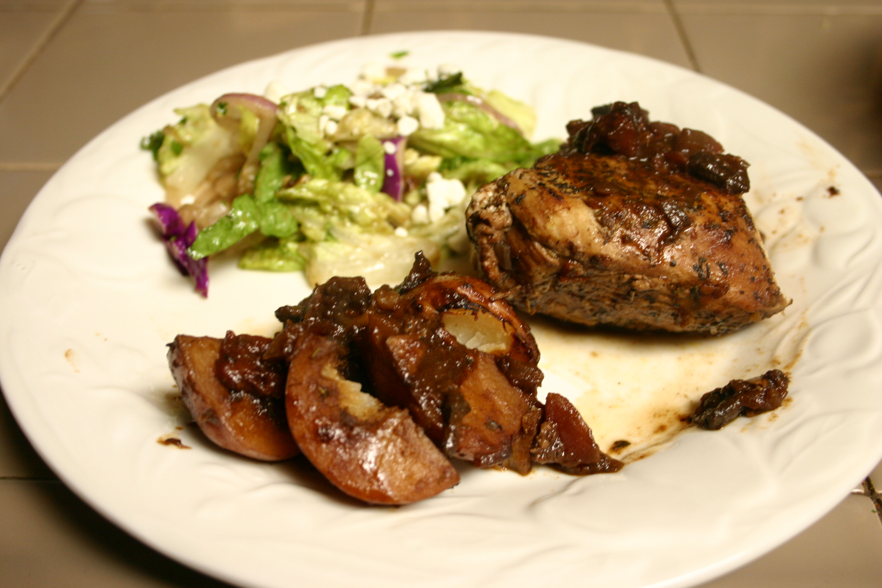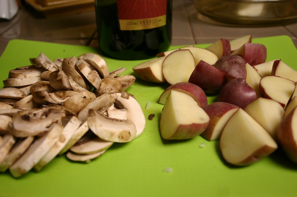 While the breasts cook, scrub potatoes, quarter and set aside. Clean mushrooms, slice and set aside.