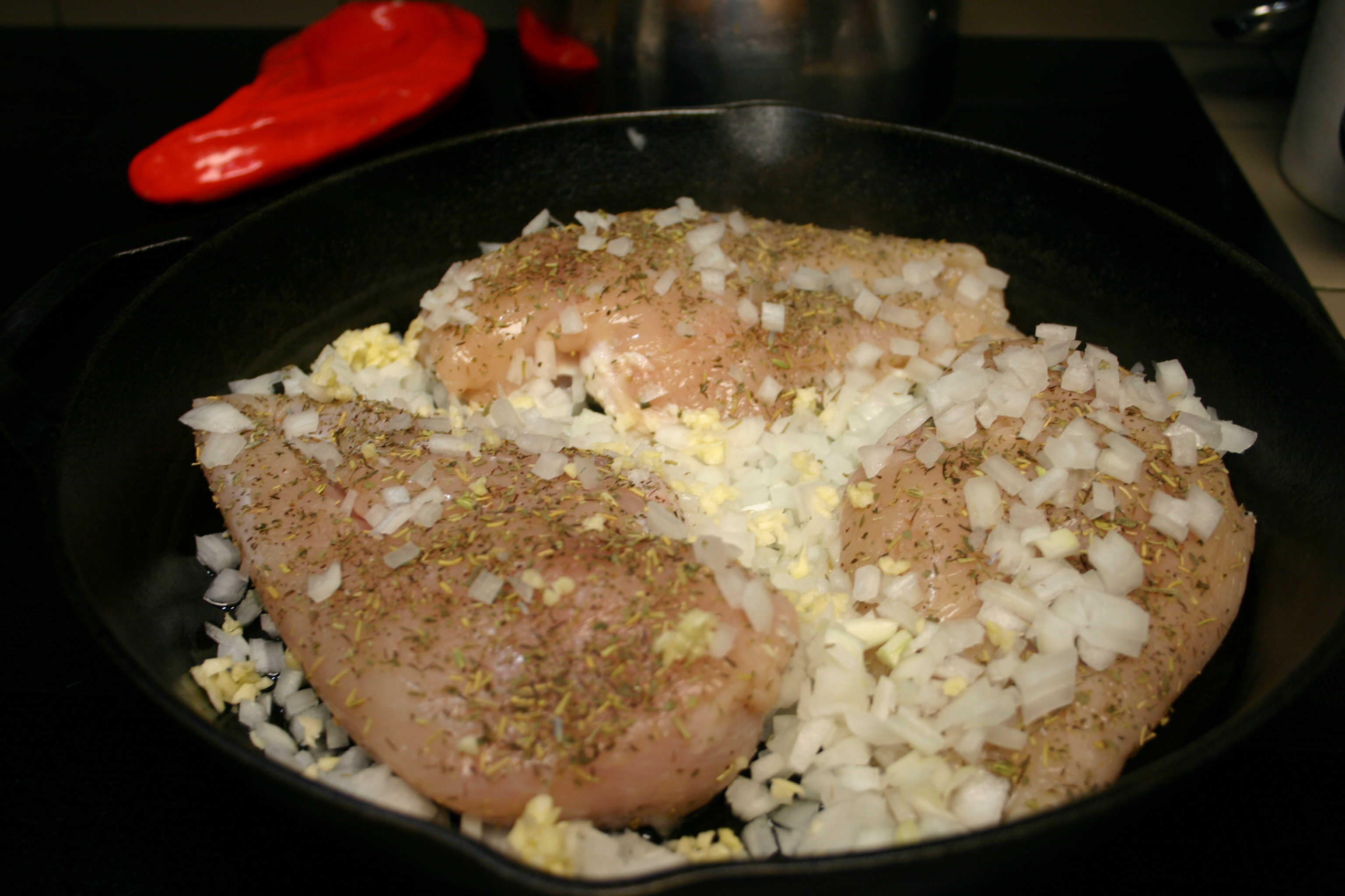 Season chicken breasts with herb seasonings, set aside. Cut onion in half from root to tip. Reserve half for another purpose, peel and dice remaining half, set aside. Peel and mince garlic, set aside.