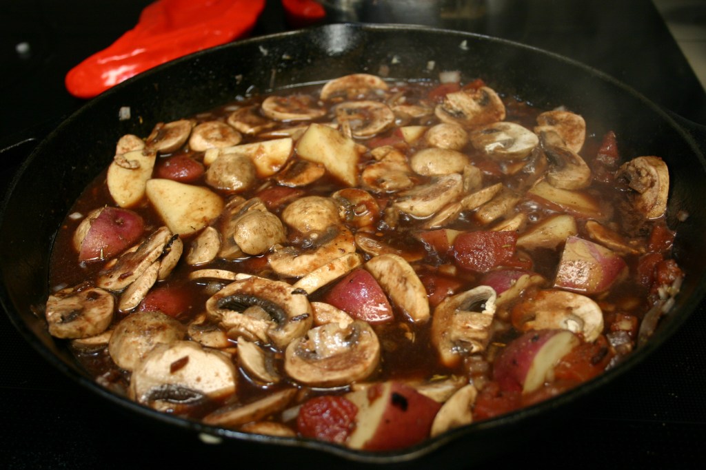 Once the chicken breasts have been removed from the skillet, add potatoes and mushrooms to the skillet along with the wine and tomatoes with their juices. Bring to a boil, cook over medium-high heat until the potatoes are nearly fork-tender, about 25 minutes. Stir occasionally to prevent scorching.