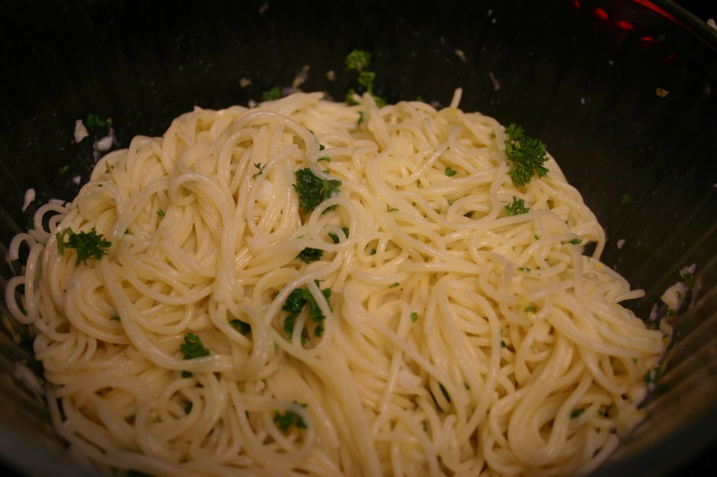 When ready, pour reserved pasta water of the cooked pasta, toss. Add garlic, lemon zest and parsley. Juice lemon directly over the pasta. Add olive oil and butter, toss again. Season with salt and pepper. Serve pasta warm or at room temperature and enjoy.