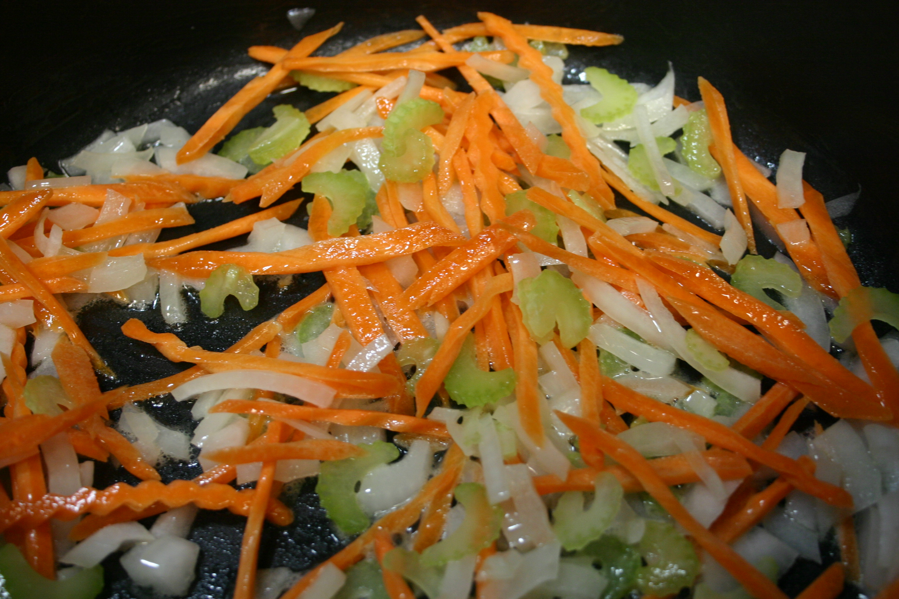 Stack carrot slices, cut into thin strips and set aside. Clean celery, trim ends, slice into thin half-moon slices, set aside. Cut onion in half from root to tip. Reserve half for another purpose. Cut remaining half in half again widthwise, then cut into thin slivers. Break apart, set aside. Peel garlic, finely mince and set aside.