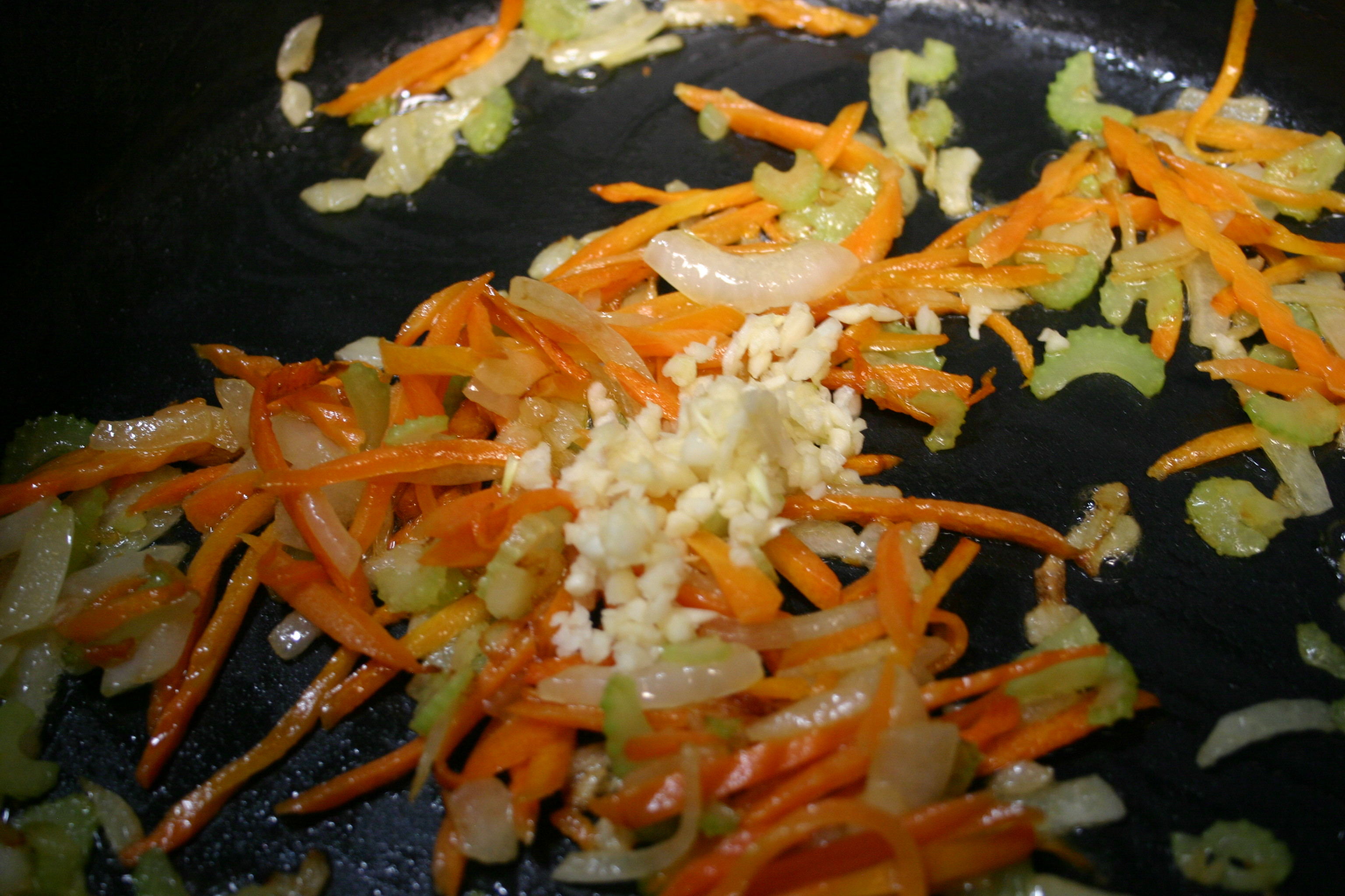Heat a Dutch Over or stock pot over medium heat. Melt butter, swirl to coat the bottom of the pot. Add carrots, celery and onions. Cook for 10 minutes, stirring frequently, until vegetables are tender and onions just beginning to turn golden. Add the garlic, cook for 1 minute.