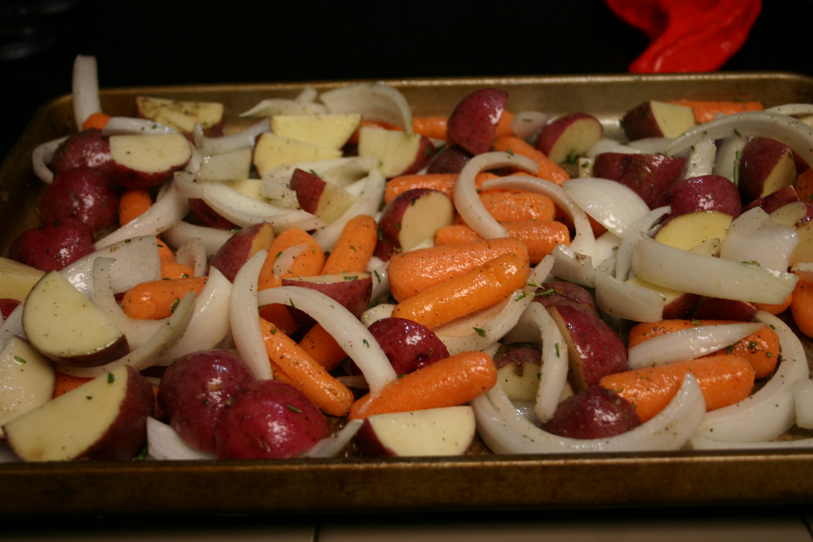 Remove pan from the oven. Push vegetables to the outer edge of the pan, clearing the center for the pork. Unwrap tenderloin and place on the pan. Return to oven and roast for about 30 minutes. Remove from oven. Turn, shake vegetables, turn pork. Return to oven, continue to roast another 10 minutes or until pork reaches 160-degrees.