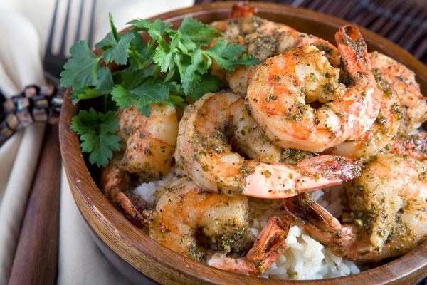 Mound rice in individual bowls. Top with shrimp, garnish with cilantro and enjoy.