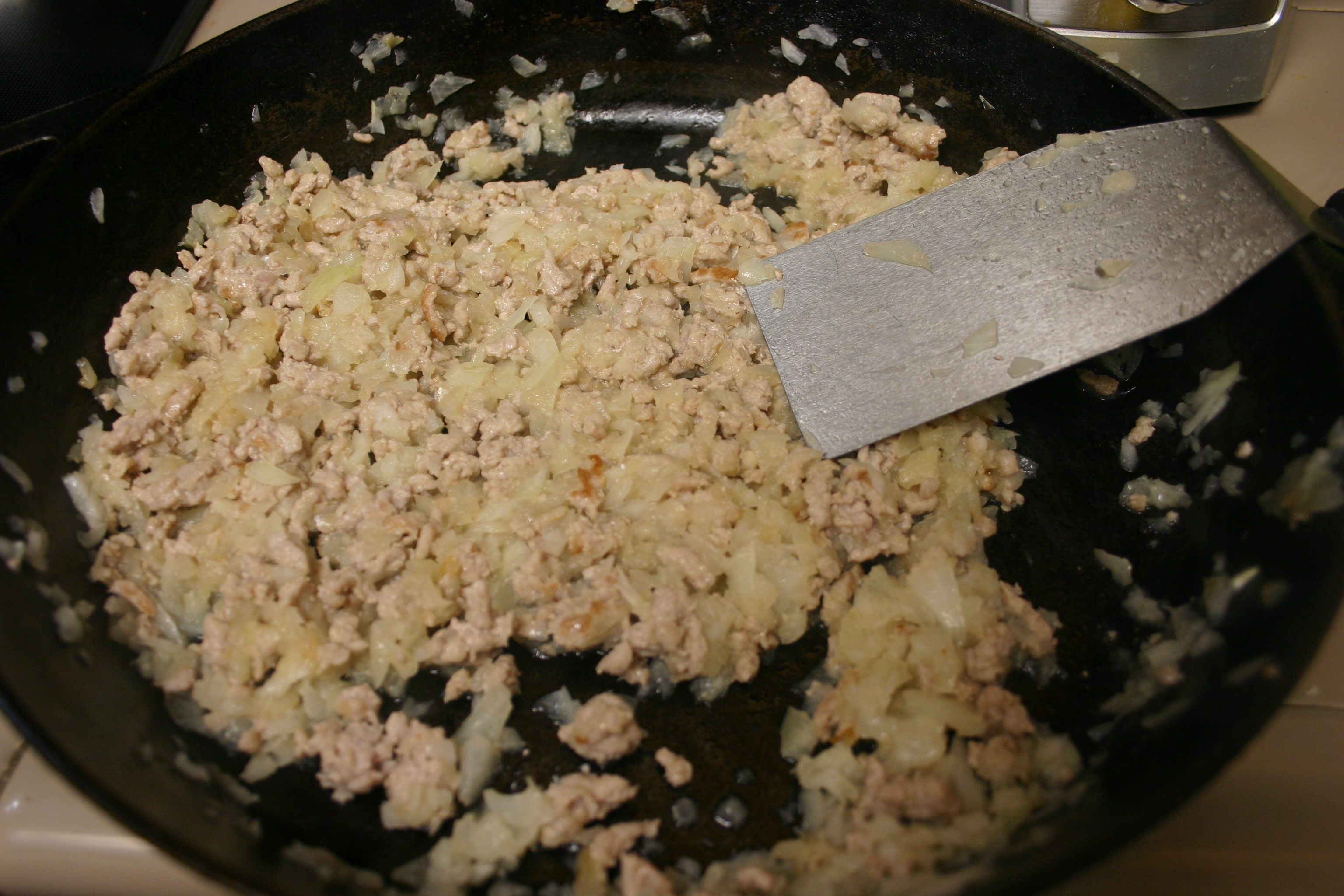 Heat olive oil in a skillet over medium to medium-high heat. Add ground pork and onions; cook, stirring until sausage is browned through, about 8 minutes. Transfer pork and onion mixture to the bowl of a slow cooker.