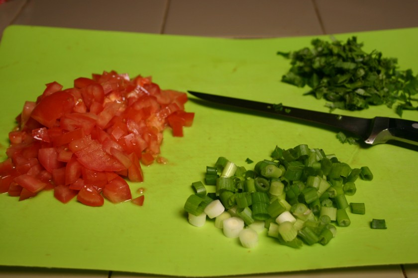While the breasts cook, seed and dice tomatoes, set aside. Trim and slice green onions, set aside. Mince cilantro, set aside.