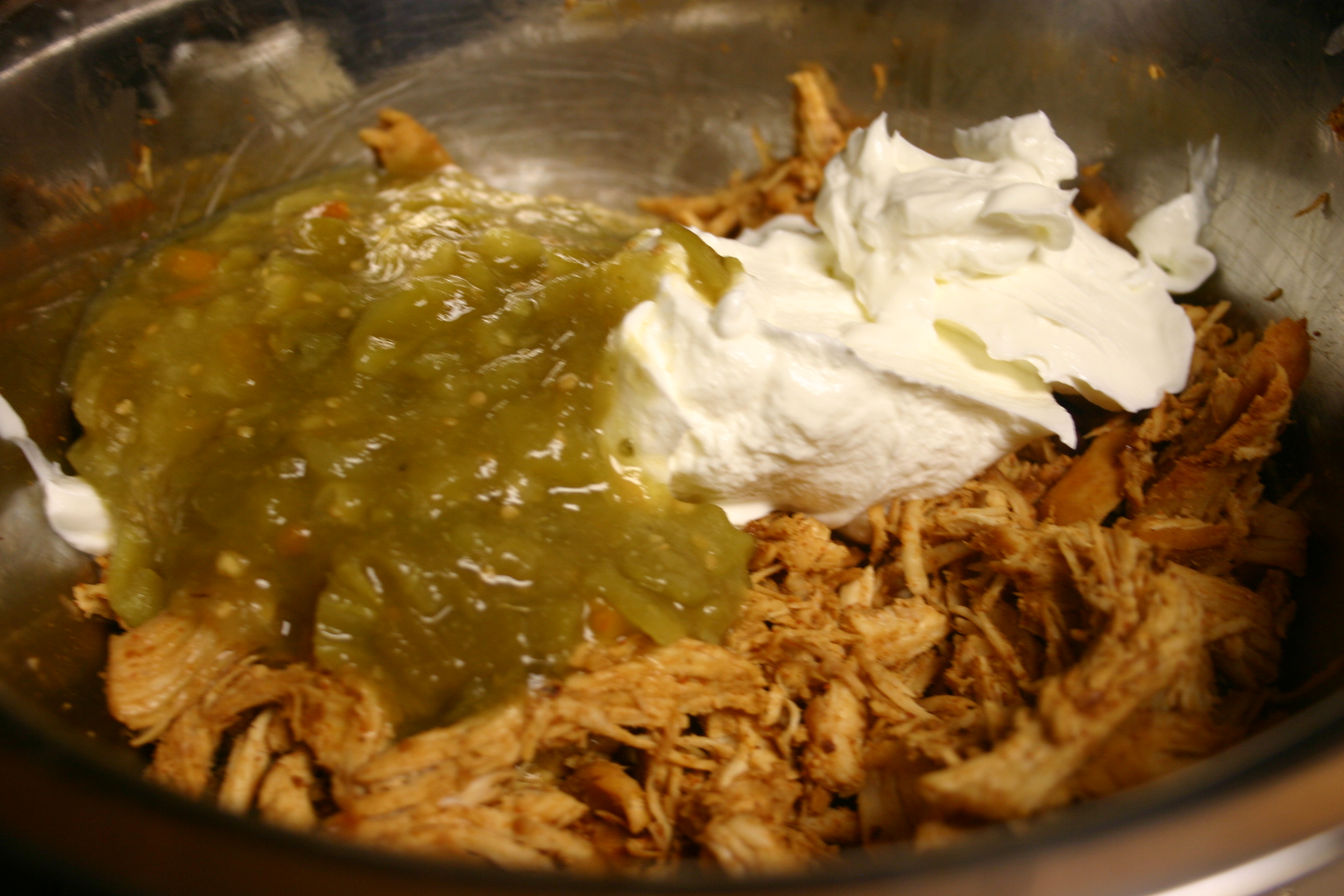 Once the chicken is cooked through and tender, remove from skillet. Let cool a few minutes, then shred. Combine shredded chicken in a bowl with sour cream and 3/4-cup of the salsa. Set aside.