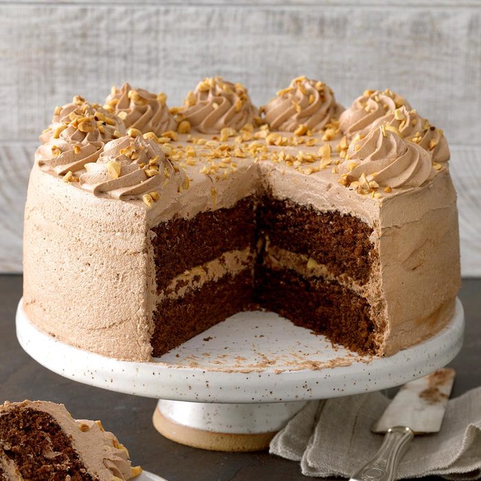 Spread bottom later of cake with 1 cup of the frosting. Sprinkle with about 1/4-cup chopped nuts. Top with remaining cake layer. Frost top and sides with remaining frosting. If desired, pipe frosting in decorative swirls on the top. Sprinkle with remaining chopped hazelnuts.
