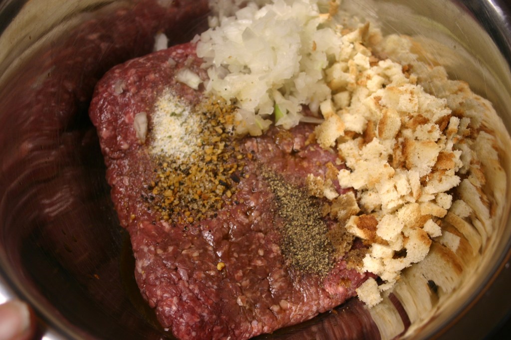 In a large bowl, lightly mix diced onions, bread pieces, ground beef, vinegar, liquid smoke, Worcestershire Sauce, Steak Sauce and seasonings. Divide meat mixture into 4 equal portions. Roll into balls, flatten and shape into four 3/4-inch thick patties. Set patties aside.