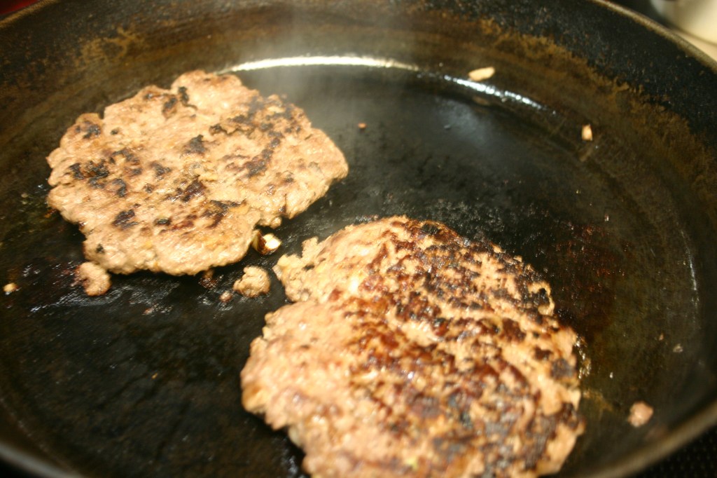 Heat al large cast iron or other heavy skillet over medium heat. Once hot, cook patties about 4 minutes or so per side. Remove skillet from heat, top patties with cheese. Cover skillet and let the cheese melt over the burgers while the buns are prepared.