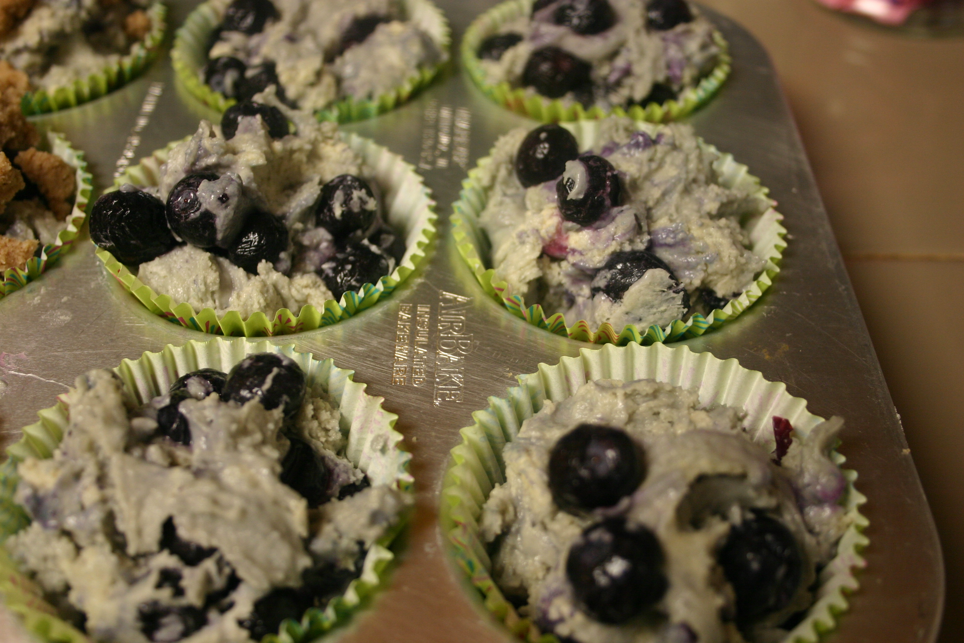 Gently fold blueberries into the batter. Make sure it is folded in completely, otherwise you’ll have plain batter at the bottom of the bowl. Spoon batter evenly into the prepared muffin tin. Set aside.