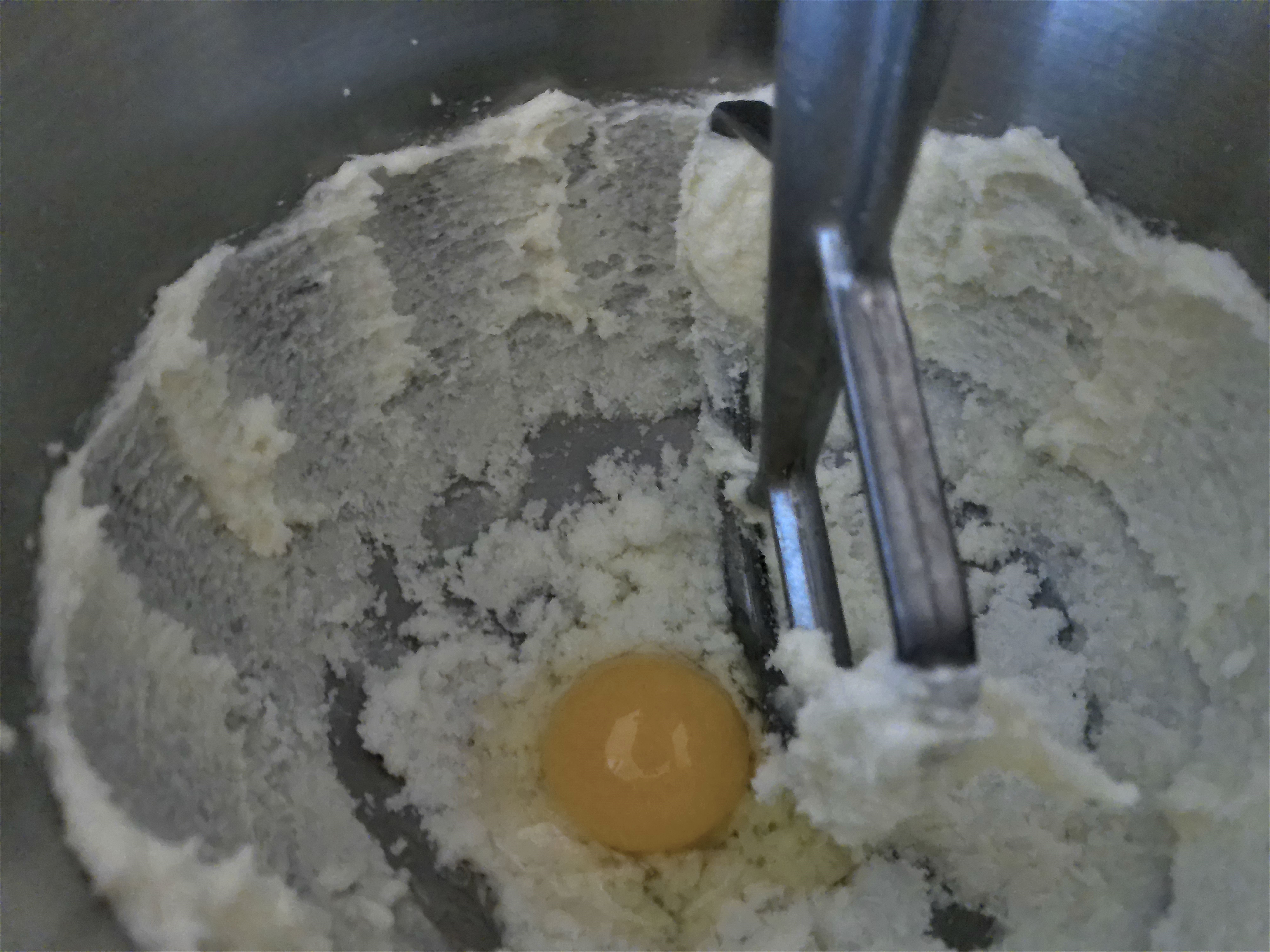 In a large mixing bowl, cream together the butter and sugar until light anf fluffy. Beat in eggs, one at a time, mixing well with each addition. Add vanilla, set aside.