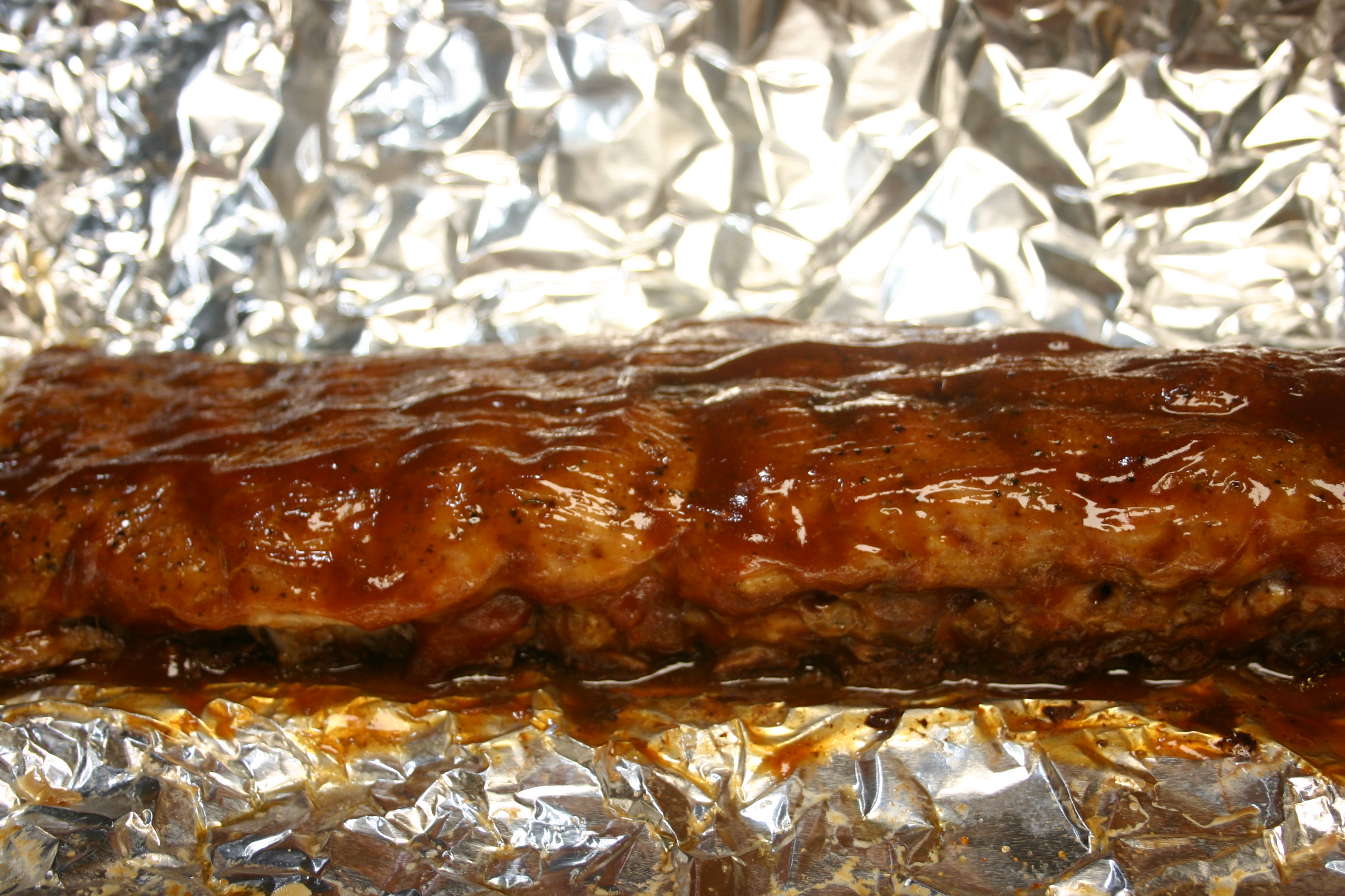 Place ribs on the foil, wrap tightly to seal. Place on the baking sheet, slide into the warm oven to slow-bake for about an hour. Carefully remove baking sheet from the oven, open to expose the ribs. Pour about a third of the barbecue sauce over the rubs, brush to spread and coat well. Seal foil tight again, return to the oven. Continue to slow cook for another hour without peeking.