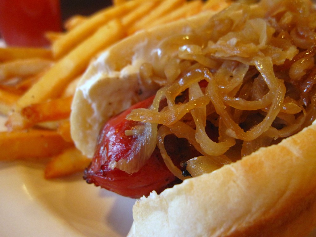 Warm buns, if possible steam buns. Split buns open, smear with cream cheese mixture, top with sausage, pile on the onions and enjoy.