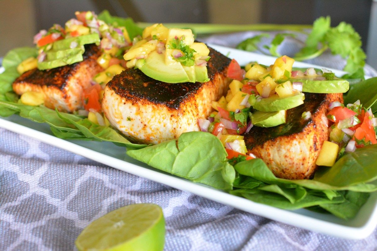 Line a serving platter with lettuce leaves. Plate filets on the bed of lettuce. Spoon Mango Salsa and slices of avocado over the fish. Serve with lime wedges or rounds on the side.