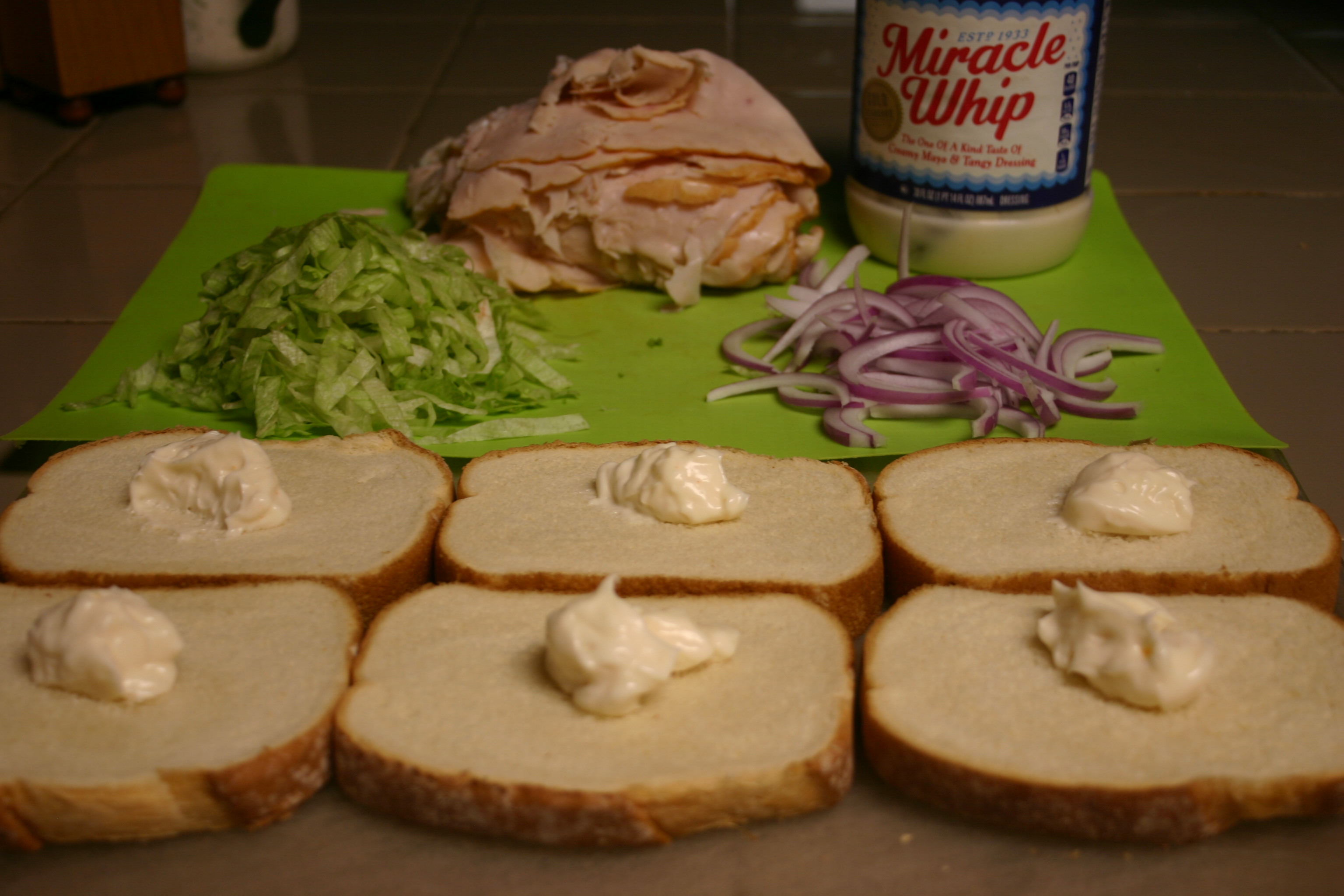 Lay bread out on a flat work surface. Spread about a tablespoon of Miracle Whip on each slice ob read. Divide turkey meat evenly among 4 slices of bread, season with black pepper. Top turkey with shredded lettuce and onion slivers. Close with remaining bread slice.