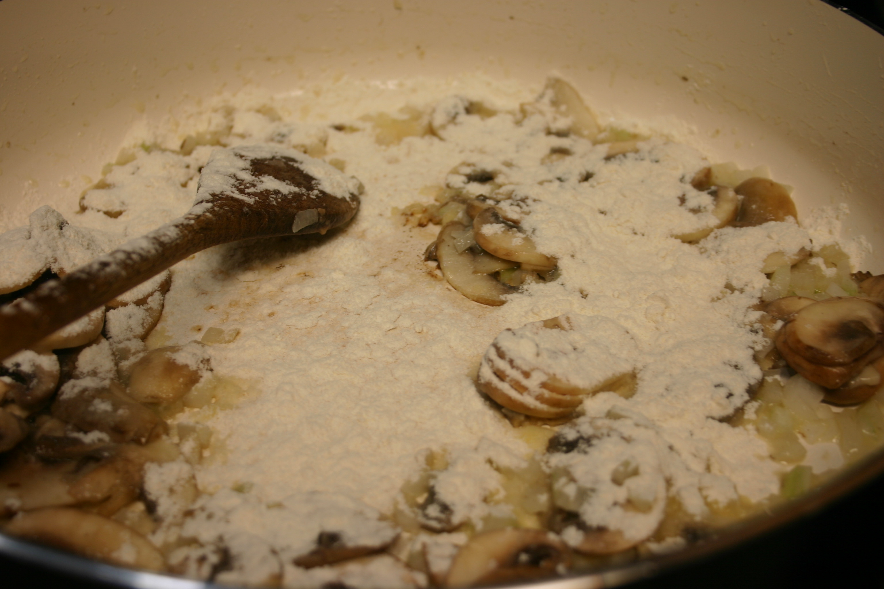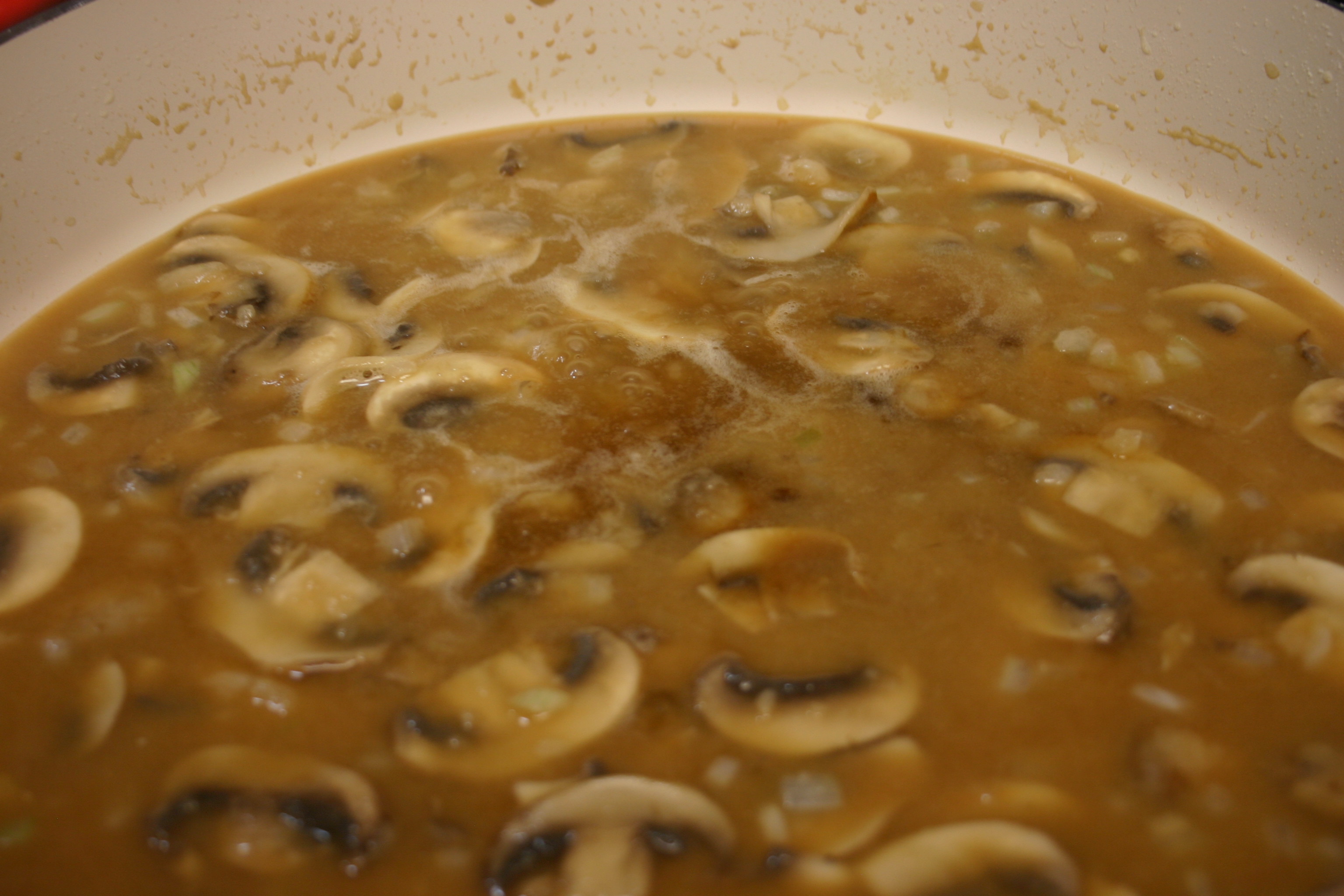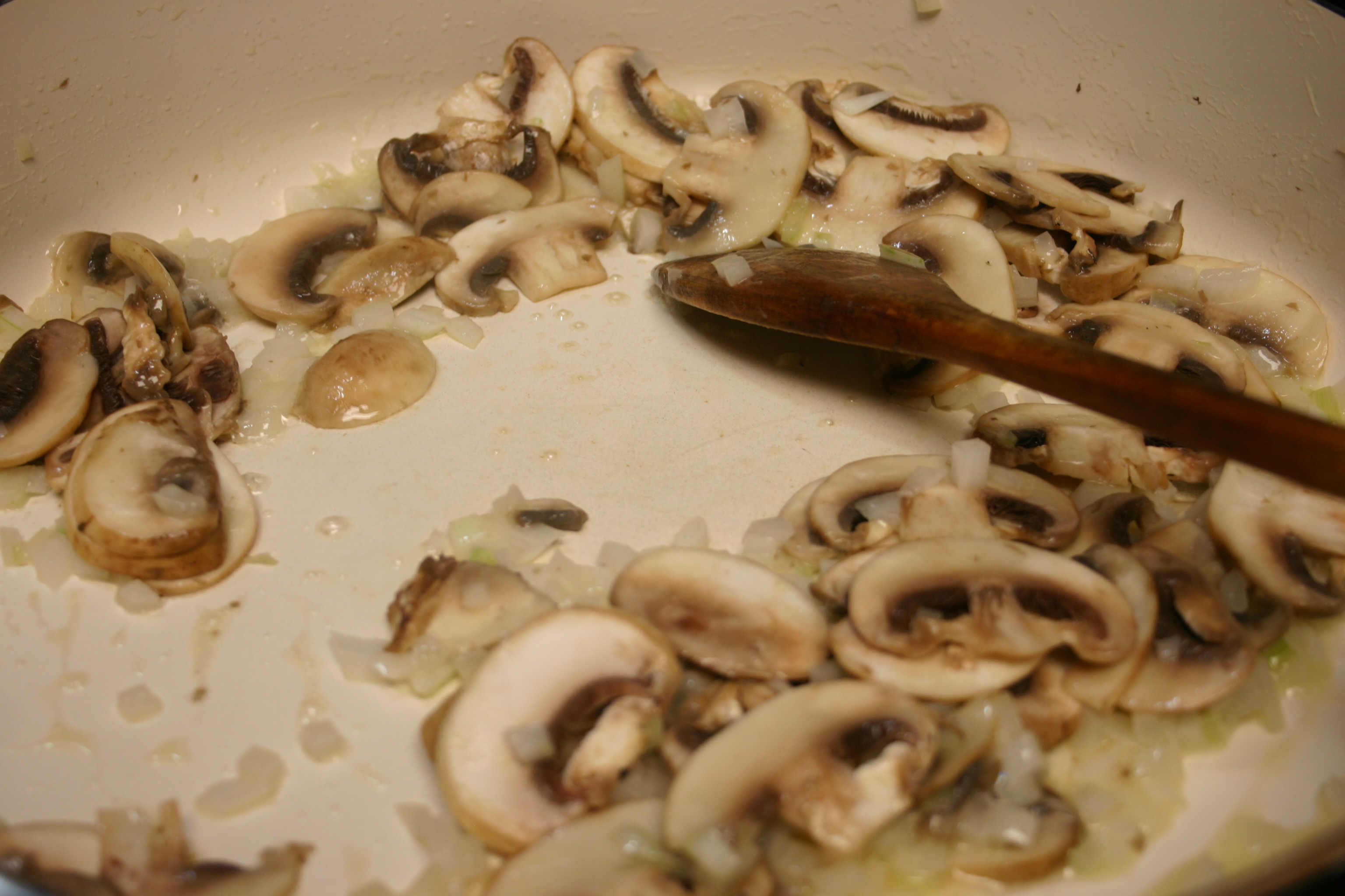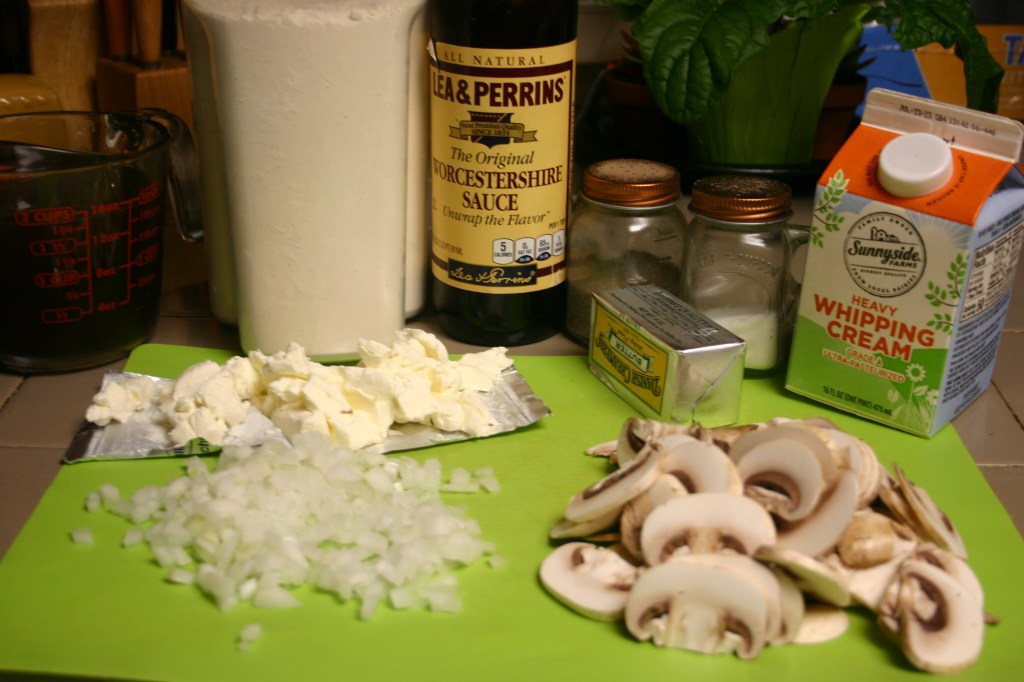 Meanwhile, clean, stem and slice mushrooms, set aside. Slit onion in two places from tip to root to remove a quarter of the onion, reserving the rest for another use. Peel and dice the quarter wedge, set aside. Cut softened cream cheese into small cubes, set aside.