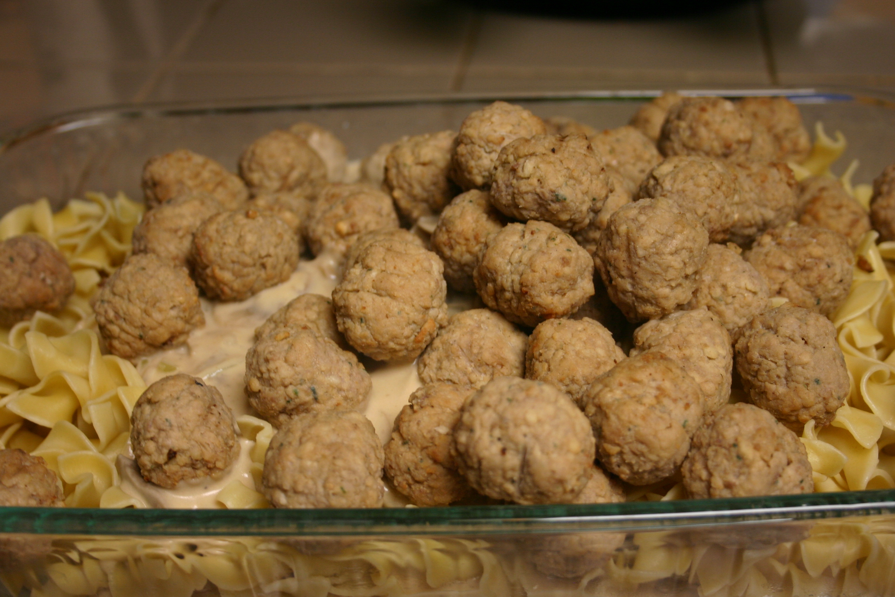 In the prepared baking dish, mix noodles, sauce and meatballs. Stir gently to coat meatballs and pasta in the sauce. Cover; place in the heated oven and bake for 30 minutes or until sauce is bubbling and the casserole is heated through. Remove from oven, stir, then let rest for 5 minutes.