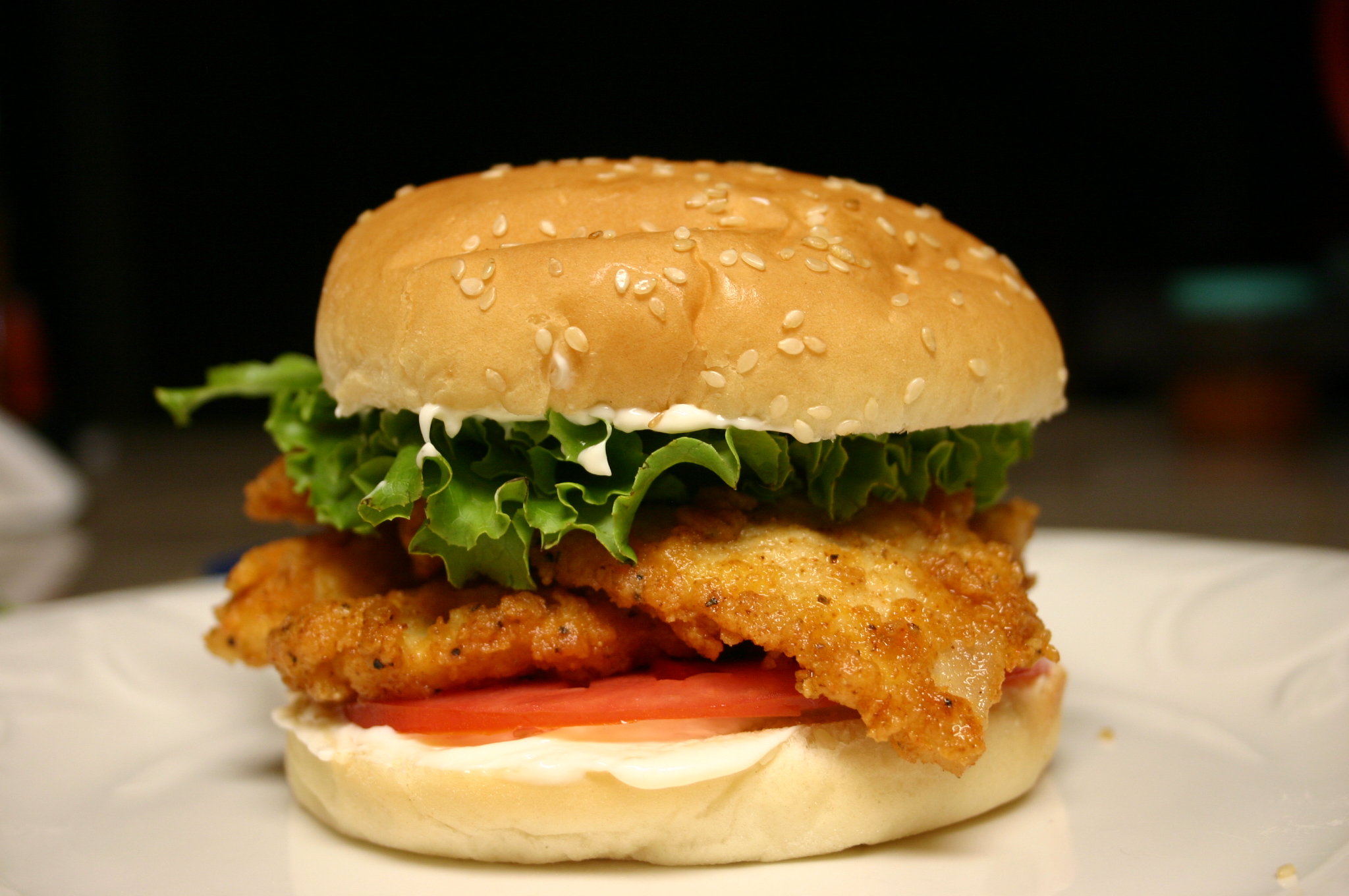 When ready to assemble, split buns. Smear mayonnaise on the top and bottom bun. Place a tomato slice on the bottom bun, top with chicken, lettuce and the top bun. Serve and enjoy.