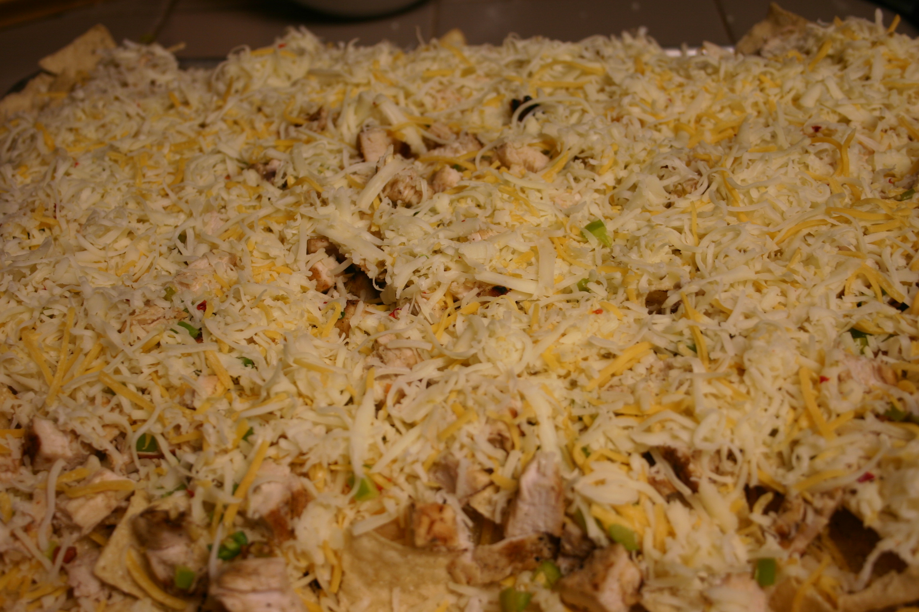 Dice chicken breasts into bite-size pieces. Scatter chicken over the pepper layer. Top with remaining cheese. Place in the heated oven to bake until the cheese has melted, about 10 minutes or so.