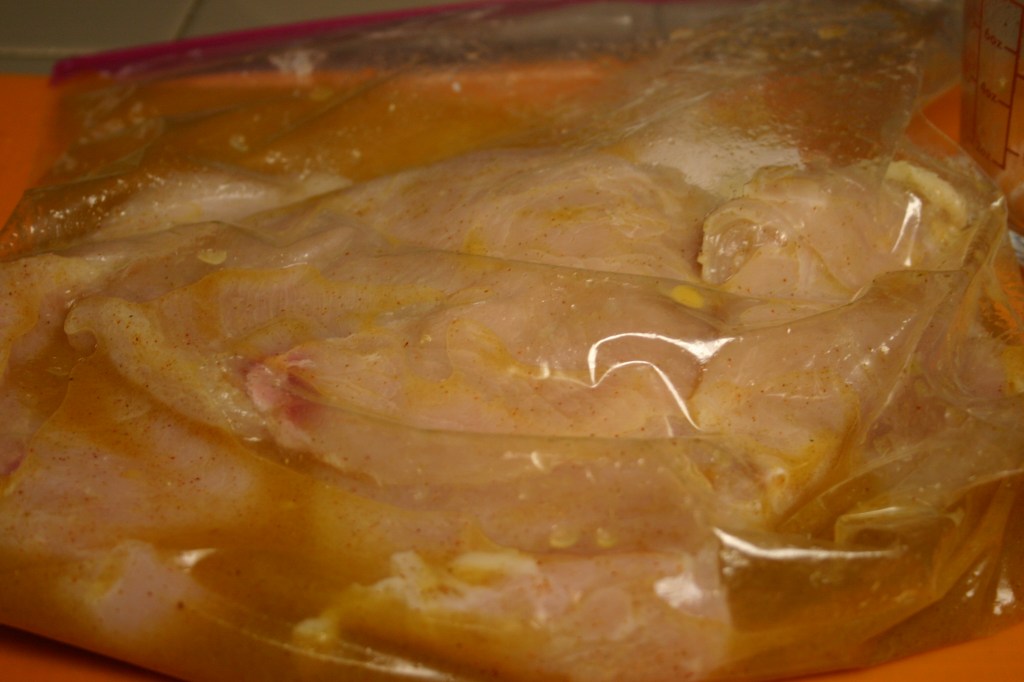 Cut lime in half, set aside. Slice chicken breasts in half lengthwise to create 4 thin breasts. Place in a zip-lock bag and set aside.