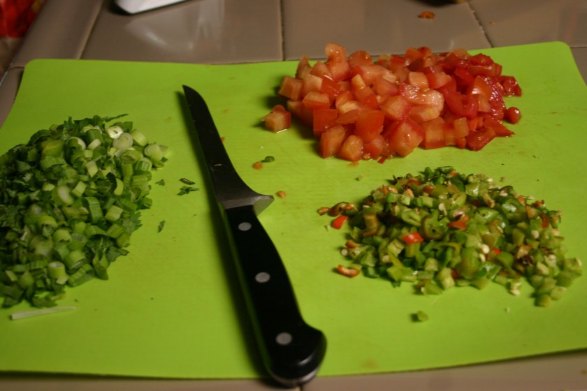 Seed and dice tomatoes, set aside. Stem and finely dice peppers. Mix peppers together, set aside.