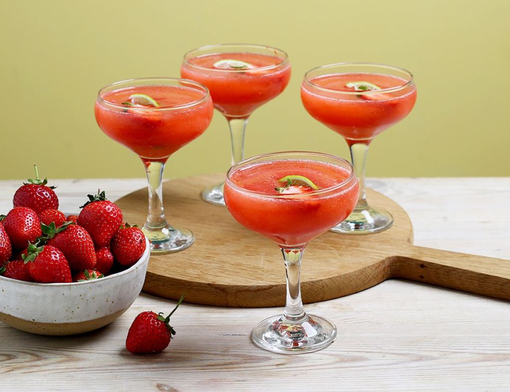 Pour into chilled Daiquiri or Margarita glasses. Cut fresh strawberries in half, float in the cocktail. Cut lime into wedges, place near berries. Serve and enjoy.