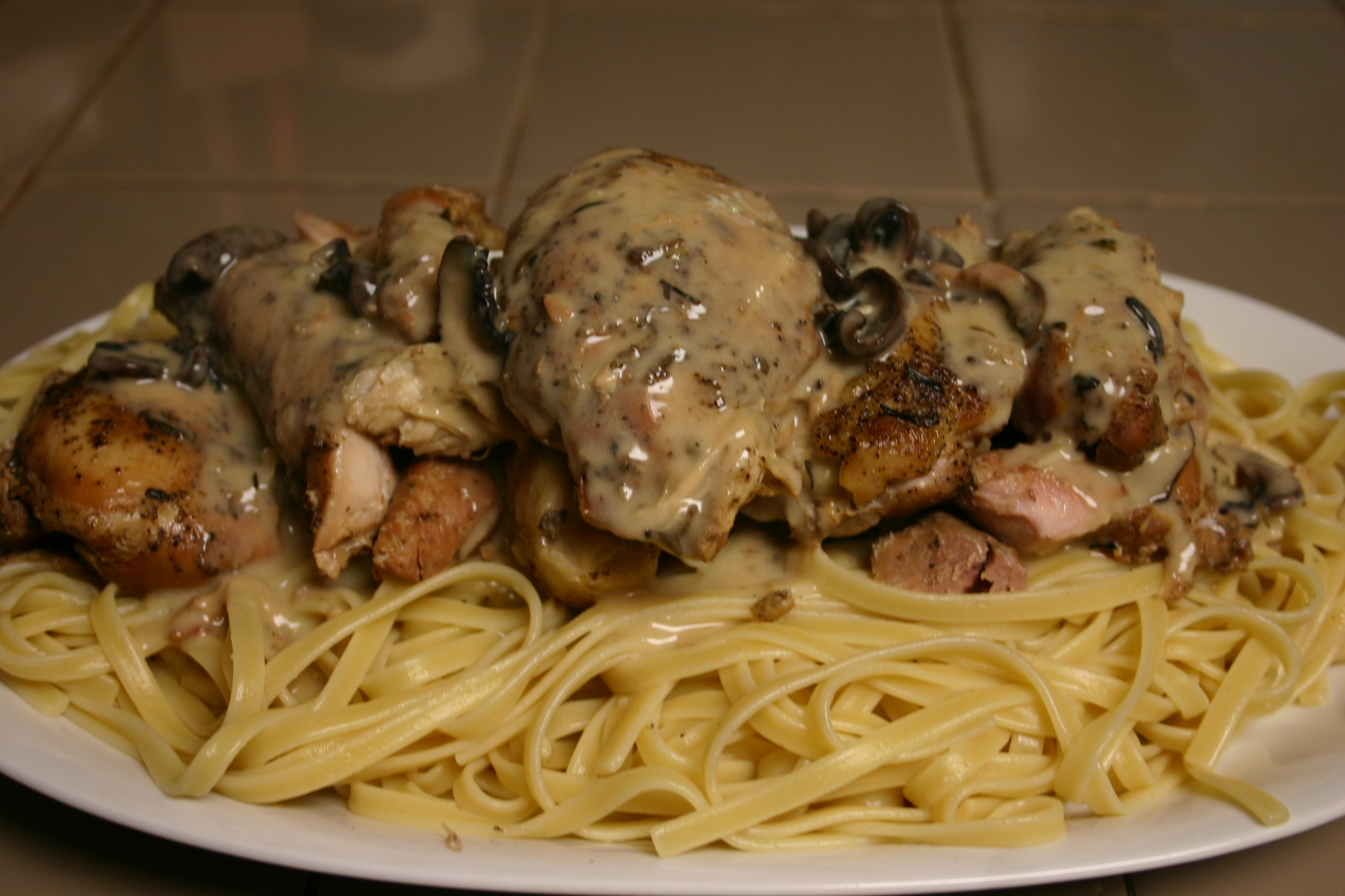 Remove chicken thighs from the cooker, cover and kepp warm. Ins a small bowl, stir cornstarch and heavy cream until well blended. Stir slurry into the liquid in the cooker. Cover, increase cooker to HIGH and cook for 15 minutes or until sauce has thickened.