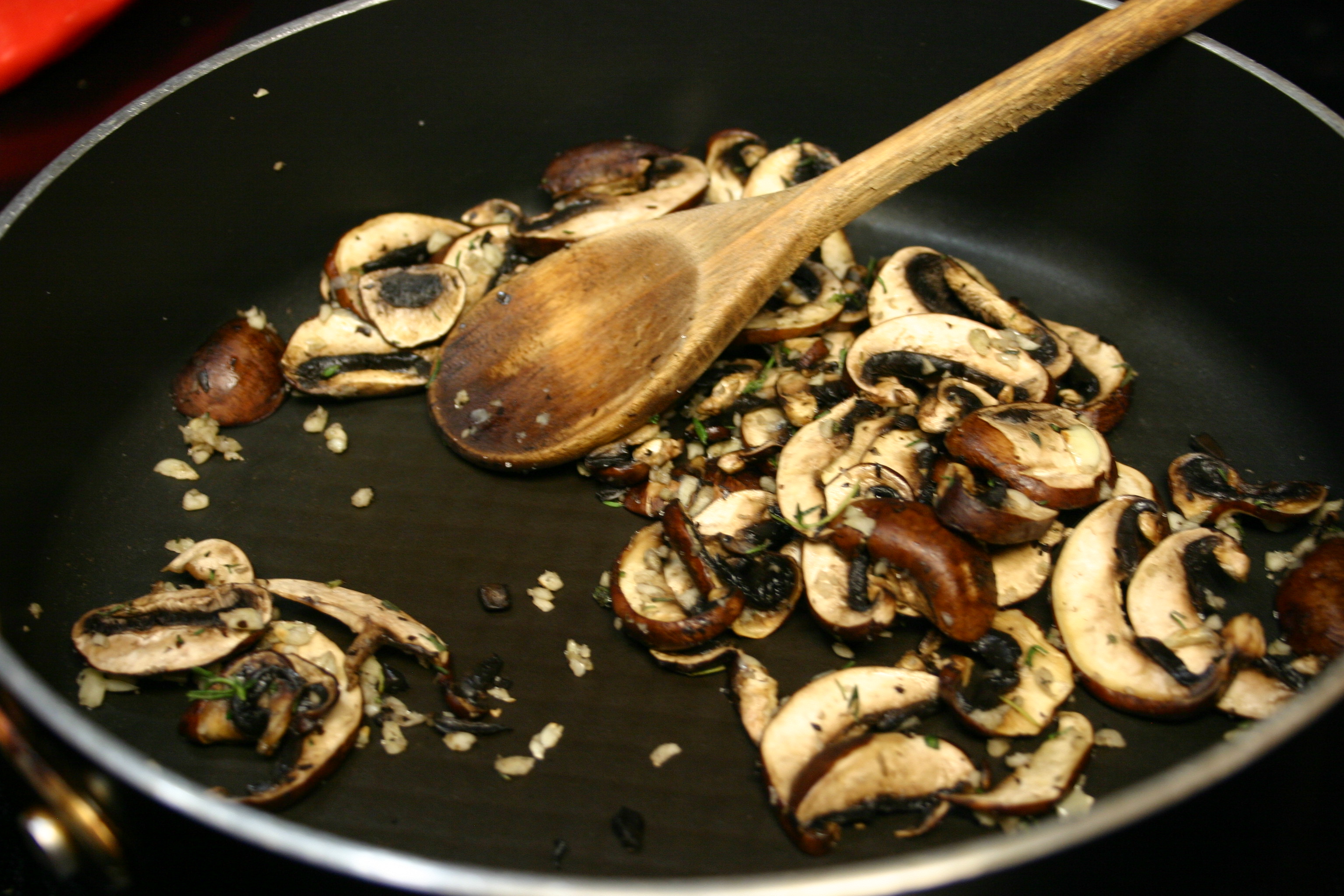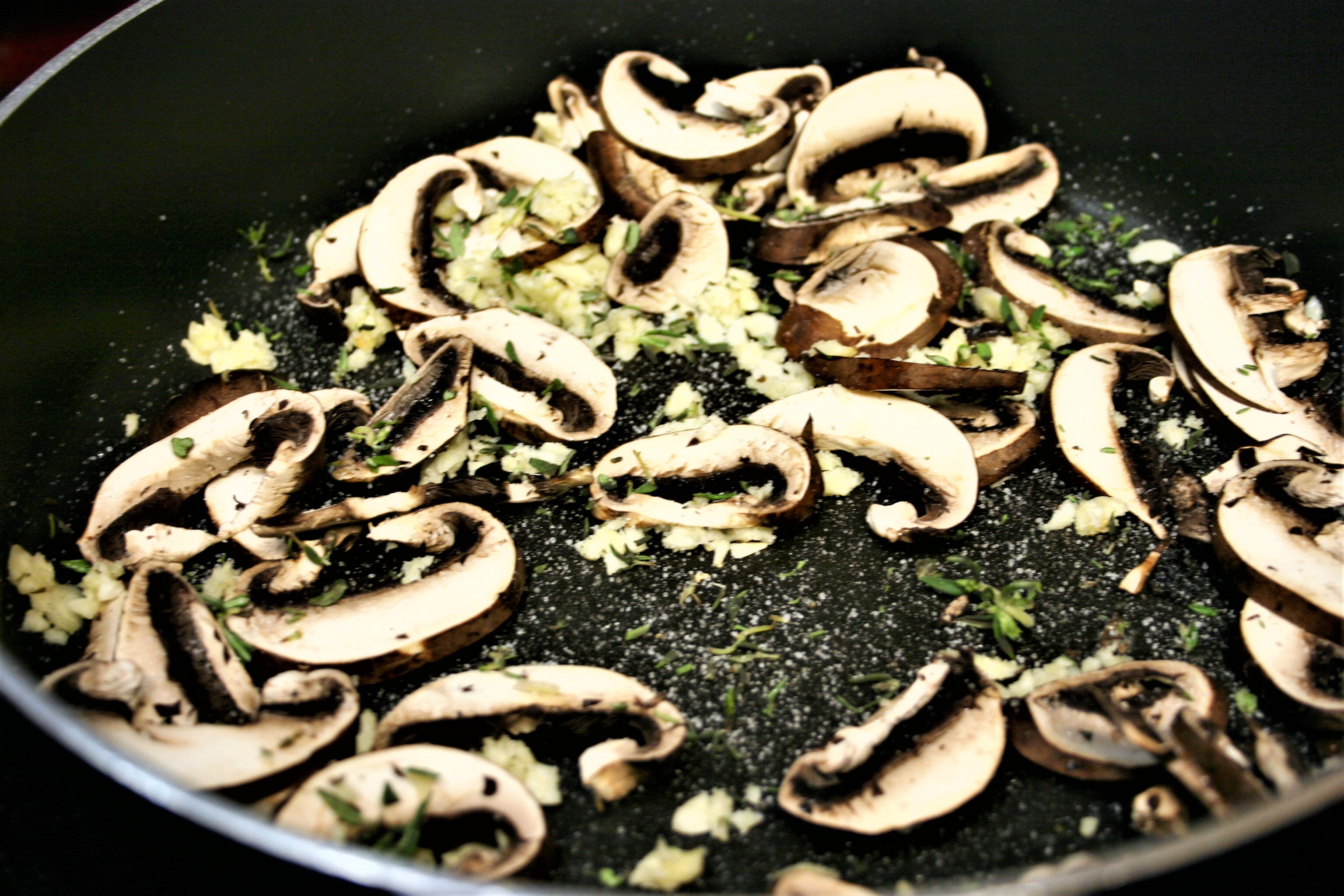 Peel and finely mince garlic, set aside. Strip Thyme leaves from sprigs, set aside. Clean and slcie mushrooms, set aside.