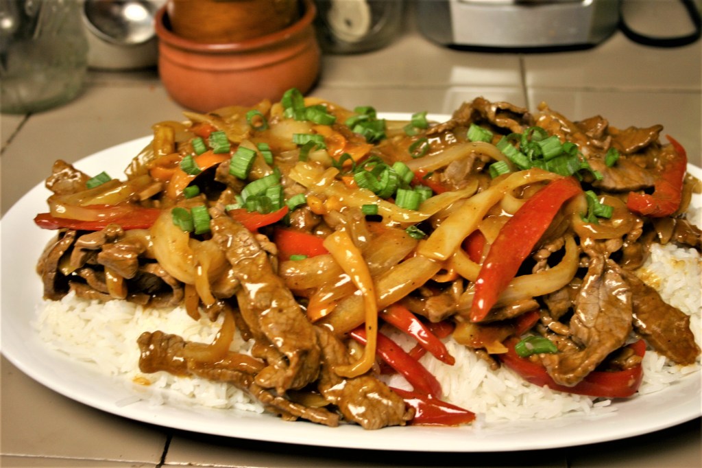 Spread rice out on a serving platter. Spoon beef mixture over the bed of rice. Snip green onions, sprinkle over the top. Serve and enjoy.