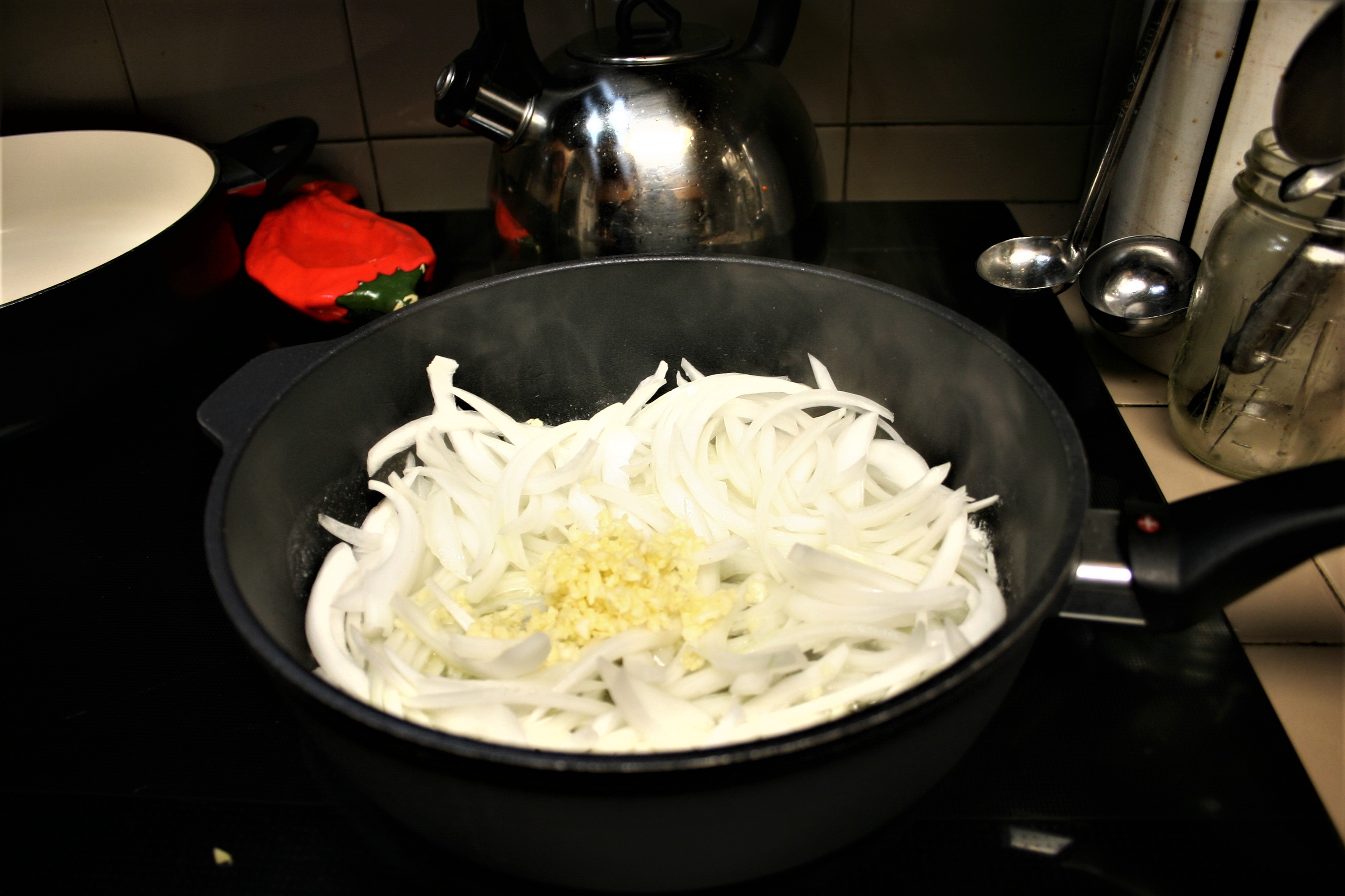 Peel, quarter and thinly slice onion, set aside. Peel and finely mince garlic, set aside. Clean and stem mushrooms, slice and set aside. Snip parsley, set aside.
