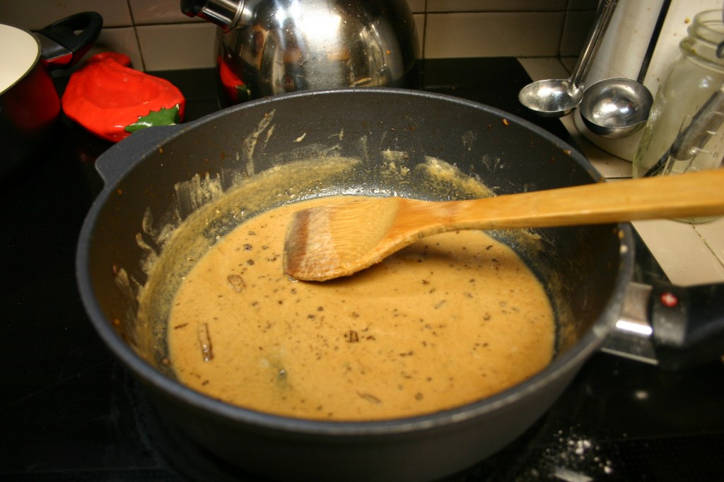Melt remaining 2 tablespoons of butter into the saucepan. Stir flour slowly into the butter. Cook, stirring over low heat, until flour is a deep brown, about 8 minutes. Remove from heat.