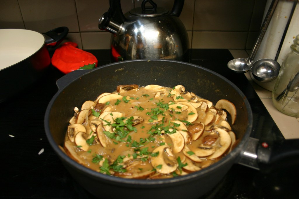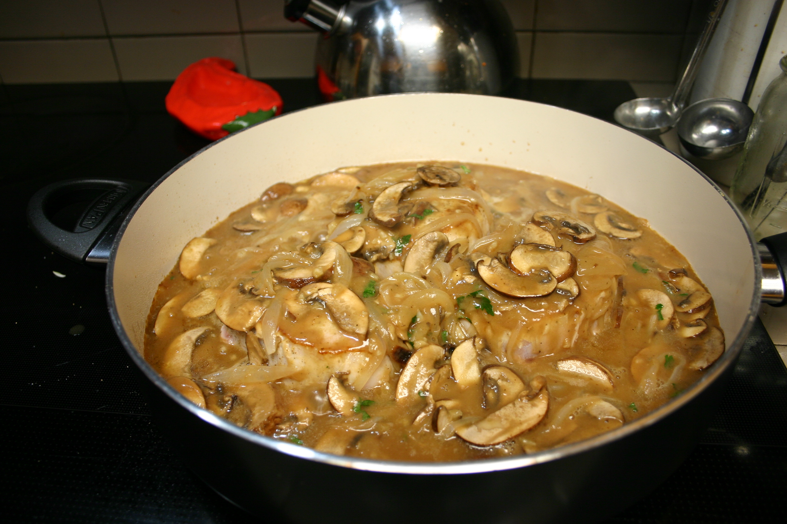 Gradually whisk in beef stock off heat. Return sautéed onion mixture to the pan. Stir in mushrooms, sprinkle with parsley. Bring gravy to a boil, stirring constantly. Remove from heat, set aside.